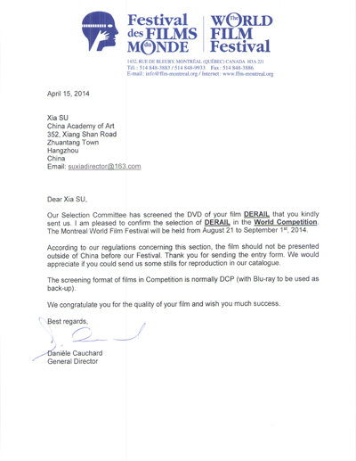 由传媒动画学院苏夏教授执导的短片电影《轨》(DERAIL),近日入围了蒙特利尔国际电影节“世界竞赛”单元。蒙特利尔电影节是国际电影制片人协会(FIAPF)官网公认的国际A类电影节之一,它与戛纳、柏林、威尼斯、卡罗维发利电影节一道,被国际电影联合会确定为国际五大电影节。苏夏导演作品的入围,也是我院“戏剧与影视学”教学创作的一次突破。