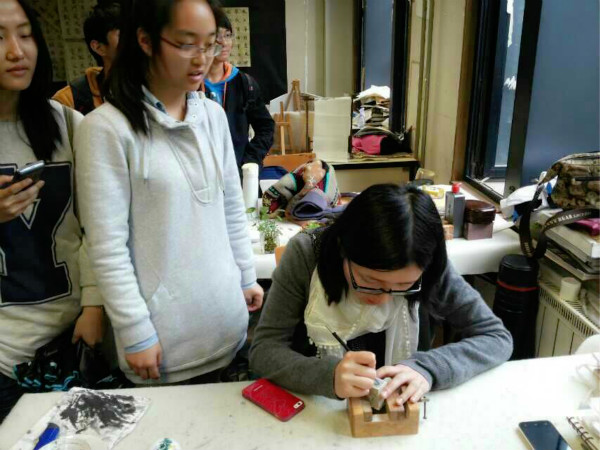 交流会上,我院同学向杭电师生介绍了我院千村千生社会实践、午后时光、社团文化节等品牌活动开展情况。会上杭电同学们踊跃提问,对我院寝室文化建设、心理健康教育、社团良性发展、艺术实践等数十个活动热情度高。会上,我院团委特赠《千村千生十年成果集》、《国立艺专往事》书籍以及书法横幅“惠风和畅”与杭电师生。随后,我院南山校区学生干部组成的六支队伍,分别带领杭电师生参观了我院国画系、书法系、油画系、跨媒体艺术学院等,并在国画系教室,师生现场体验篆刻艺术,劳作上手、气氛高涨。