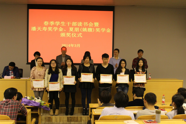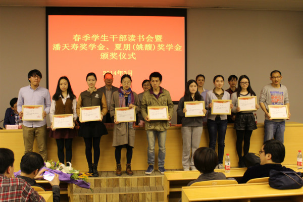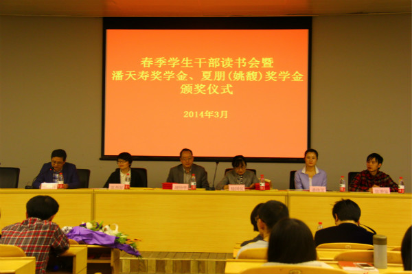 3月29日,我院2014年春季学生干部读书会暨潘天寿奖学金、夏朋(姚馥)奖学金颁奖仪式在南山校区学术报告厅举行。院党委副书记胡钟华、潘天寿基金会会长励国仪、夏朋烈士家属、学工部、团委负责人、分团委书记、辅导员及来自各院系的学生干部和获奖学生近200人参加了读书会。会议由团委书记竺照轩主持。