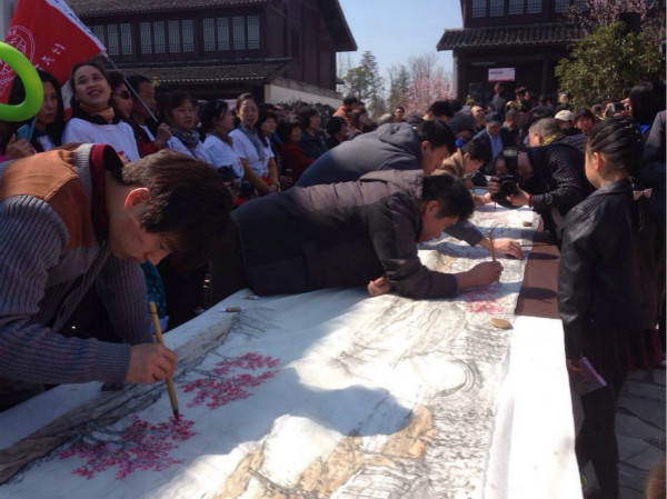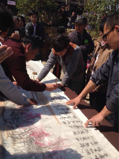 开幕式上,院党委副书记胡钟华为写生创作比赛获奖学生颁奖,原正校级巡视员高法根与我院国画系学生一同激情挥毫共绘皋亭千桃园长卷,助力江干区皋亭山文化宣传、旅游推广。市民代表宣读了孝道文化倡议书,师生和市民朋友一同在“孝道无言,皋亭作证”的画卷上签名,与地方政府共倡孝道文化,并向当地老人赠送了我院学生专门为他们绘制的肖像作品。
