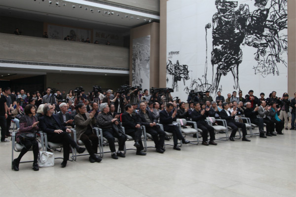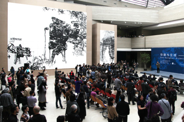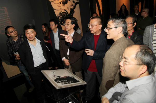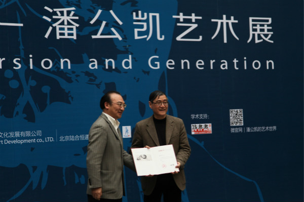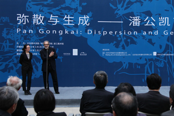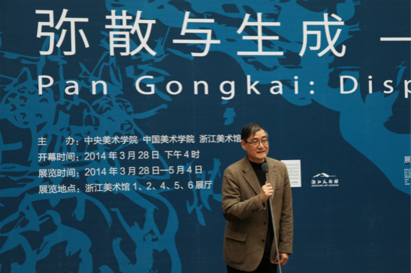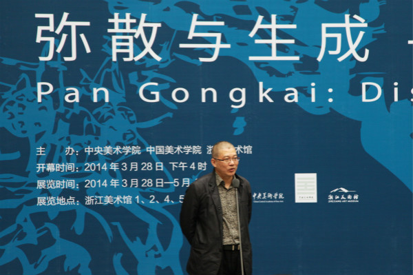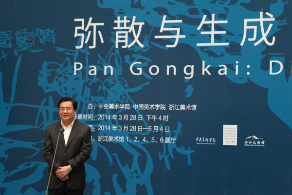 许江院长在致辞中指出,该展览将为浙江美术馆树立一个新的个展的恢弘标杆,他说“这些众多的作品能让观众感受到潘老师创作的激情,看到他笔墨表现的生命力,以及他的勤奋。”他以“不凡的跨界者”来评价潘公凯在国画、装置、理论、建筑等几个不同领域的跨越,不仅作为画家坚守中国大写意绘画的笔墨,也以各种艺术表现的平台展开多重的臆想,深入中国传统文化来面对数字媒体的挑战。他认为跨越背后是潘公凯身上所具有的“文心”、“宽容”、“坚忍”,所以他能牢牢把握中国绘画的真谛,体现罕见的实验精神,不愧为中国艺术的一代大家。