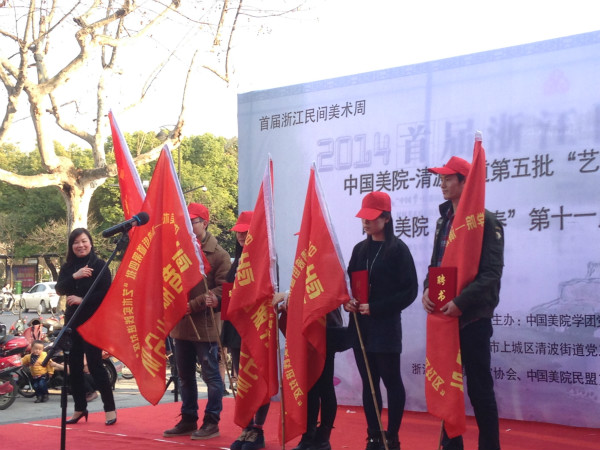 启动仪式上,第四批“艺术实践进社区”活动优秀志愿者获得了表彰,同时为第五批“艺术实践进社区”志愿者小分队授旗,并向志愿者代表发放聘书。院团委副书记徐增鎏介绍了第五批“艺术实践进社区”活动情况,清波街道党工委副书记林系州宣读了志愿者挂职任职文件。我院挂职志愿者代表赵孟晞同学作了表态发言。浙江省民间美术家协会主席、我院裘海索教授宣读了校地共建民间美术研究相关课题立项文件。最后院党委副书记胡钟华宣布活动正式启动。