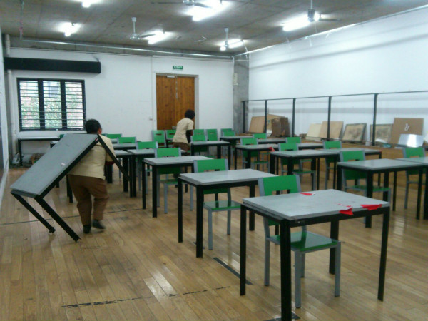 考试结束以后,工作人员又加班加点将考场内的画架、模特椅子、考生凳子全部搬运整理入库,将接线板、电缆线拆除,迅速恢复校园原有教学设施,做好新学期开学准备。
