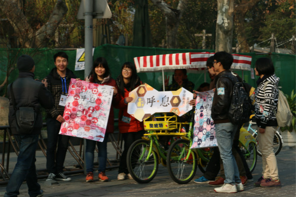 12月22日,来自中国美术学院的百余名青年志愿者身体力行,开展以“呼息——净霾有责,重现蓝天”为主题的环保公益活动。他们从南山路出发,途经湖滨银泰、西湖音乐喷泉、断桥、西泠印社、雷峰塔等地。在湖滨银泰,志愿者们号召1000名杭城路人在学生自己设计的宣传海报上签名;在西湖音乐喷泉,500名路人一起高喊“净霾有责,重现蓝天”口号;在断桥,1000名路人与宣传标语合影;在西泠印社,志愿者们向路人分发500张自己设计的明信片;在雷峰塔,志愿者们采访了500名路人谈谈对雾霾的看法。中国美术学院青年志愿者协会的同学们说:“作为一名艺术生,希望通过自己的专业技能号召人们共同为净霾做出贡献,并以此宣扬低碳环保的生活理念,重现一片美好的蓝天。”