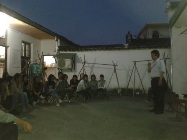 为了了解学生下乡期间饮食和住宿的实际情况,孟云生和学生一起共进晚餐,饭后又在师生住宿的地方逐个房间进行查看,并参加学生的主题班会活动。主题班会在师生住宿的小四合院召开,师生们因陋就简,在淡淡的月光和灯光下露天召开。班会伊始,孟云生在师生的热烈邀请下发表了简短讲话。他希望学生要有学校和专业的荣誉感,要热爱专业,珍惜机会。要克服困难,遵守纪律,认真完成下乡任务。班会以“大学生的理想信念和入校以来的感受”为主题,四个班长联袂主持,同学们积极踊跃发言讨论。大家围绕着专业的未来、文化课的学习、图书馆的使用、寝室的文明、班级的建设等诸多问题进行了讨论和交流,提出了问题和建议。孟云生和带队老师对同学们的问题逐一进行了详细耐心的回答和解释。一个远离杭州的山村,一个月光淡淡的夜晚,一群怀抱着“为艺术战”信念的国美人畅所欲言共话着美院的过去和现在,共梦着美院的美好未来。
