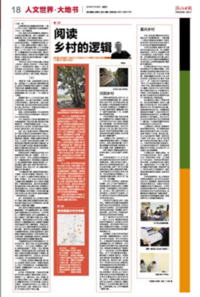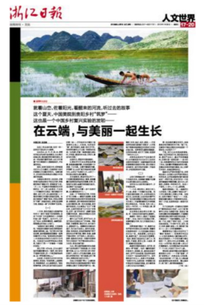 7月21日-26日,浙江日报文教科卫部主任檀梅、记者吴孟婕和党委宣传部的同志专程前往贵州,就我院与贵阳市人民政府、共青团贵州省委战略合作项目进行采访,并于7月26日在浙江日报“人文世界”以《在云端,与美丽一起生长》《阅读乡村的逻辑》为题,用两个专版的篇幅报道了在贵阳乡村“筑梦”的师生们,并对带队教师、建筑艺术学院副院长李凯生老师进行了专访,向我们呈现了建筑艺术学院师生们走村串寨、田园调研、乡土考察的生动场面和复兴乡村的美好愿景。