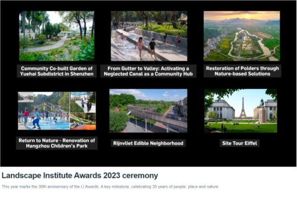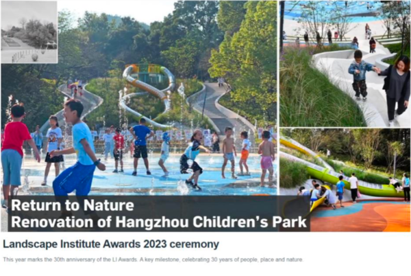 2023 年英国皇家风景园林学会(Landscape Institute)颁奖典礼于11月在伦敦以线上与线下相结合的方式举行。中国美术学院建筑艺术学院风景园林系沈实现副教授主持的项目“回归自然——杭州少年儿童公园综合整治工程设计(Return to Nature——Renovation of Hangzhou Children’s Park)”获得皇家西尔维娅•克罗夫人杰出国际贡献奖的入围奖。这也是本项目在获得西湖杯一等奖、浙江风景园林学会一等奖、国际风景园林学会亚太、非洲与中东地区荣誉奖(IFLA AAPME)、美国建筑大师奖公共景观荣誉奖(AMP)、英国风景园林行业协会国际景观奖(BALI)之后获得又一项重要国际荣誉。