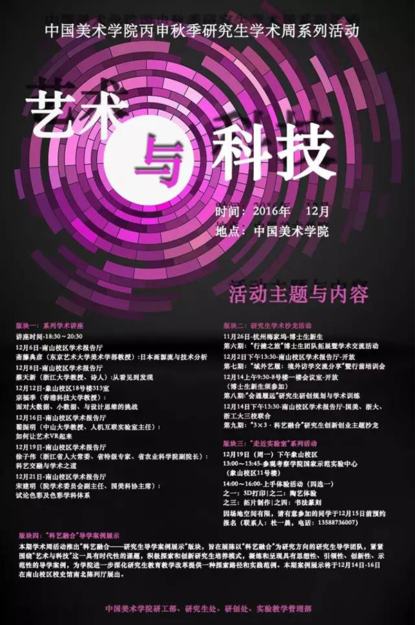 为引领研究生大力弘扬学院精神、践行校训内涵,加强学术交流、拓展学术视野、提升研创能力,强化学术道德与学风建设,丰富研究生文化生活,为研究生提供交流思想和启迪智慧的平台,由研工部、研究生处牵头,会同研创处、实验教学管理部等部门,于12月举办丙申秋季研究生学术周系列活动。以“艺术与科技”为主题,由系列学术讲座、研究生学术沙龙活动、“走近实验室”系列活动、“科艺融合”导学案例展示四大版块组成。