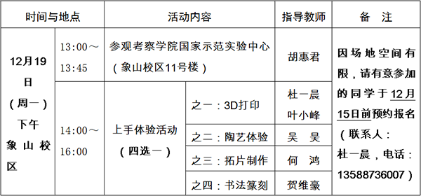 注:3D打印、书法篆刻(11号楼),拓片制作(9号楼),陶艺体验(热成型大楼)。
