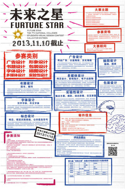 本次论坛同期将举行全国第七届大学生“未来之星”竞赛。邀请全国各院校学生递交优秀视觉艺术设计作品参加本次竞赛,包括广告、形象、书籍设计、包装设计、字体设计、插画及衍生设计、多媒体设计实验性作品八个单元的竞赛评比及展览。作品选送截止日期为2013年11月10日。(详情及参赛表格见附件)