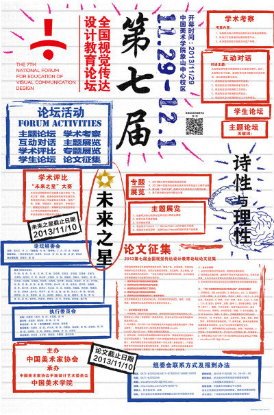 为进一步加强全国高等美术与设计院校的沟通和交流,推进我国设计教育的持续发展,深化设计文化建设,2013第七届全国视觉传达设计教育论坛将于2013年11月29日至12月1日在山水诗意的家园——浙江省杭州市中国美术学院举行。