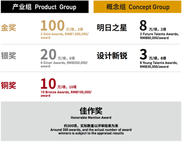 本届大奖分产业组与概念组,产业组下设“金奖”(2项、100万/项)、“银奖”(8项、20万/项)、“铜奖”(10项、10万/项);概念组下设“明日之星奖”(2项、8万/项)、“设计新锐奖”(8项、3万/项);同时,从产业组与概念组的所有作品中评选出约300件作品授予“佳作奖”(实际数量以评审结果为准)。
