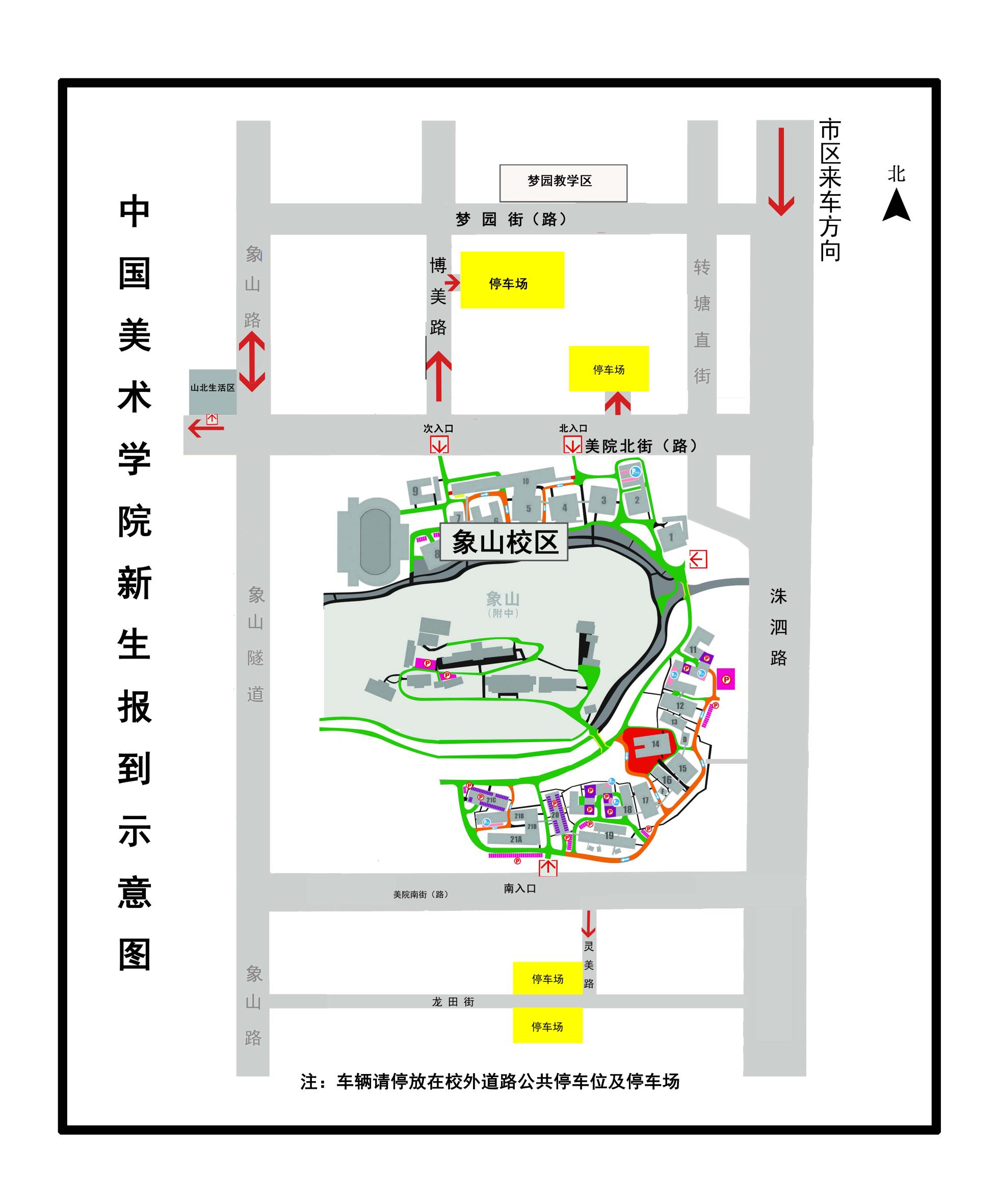 为营造良好的报到秩序,使新生报到、注册工作能够安全、有序地进行,请前来报到的新生及亲友自觉遵守以下规定: 一、因校园内人员较多空间有限,新生报到的机动车请勿进入象山校区内及山北生活区、梦园教学区。请勿滞留在象山校区各校门口(洙泗路1号门;美院北街2号门、3号门;美院南街5号门)、梦园教学区和山北生活区门口,请服从现场执勤人员的指挥停泊车辆。