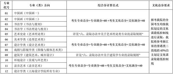 2、计算办法及文化课要求:各专业(类)方向的综合分计算公式和文化总分要求详见下表(以下对文化课分数要求:以总分满分750分,单科满分150分计)。