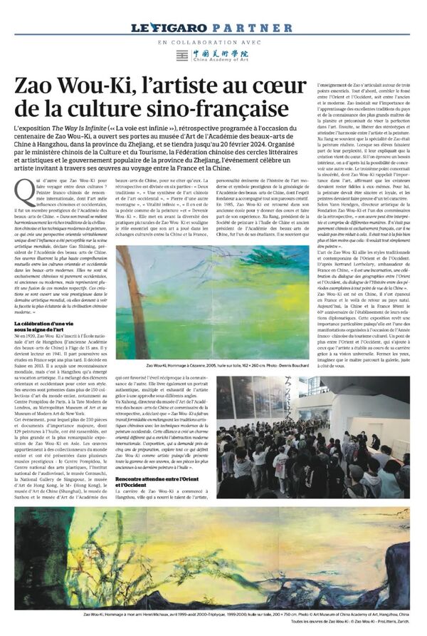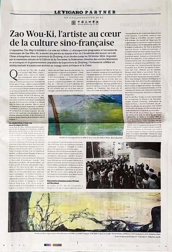 1月28日,《费加罗报》以“Zao Wou-Ki, l’artiste au cœur de la culture sino-française”(参考译文:赵无极:中法文化领军艺术家)为题整版发文,聚焦报道“大道无极——赵无极百年回顾特展”。