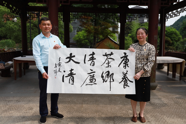 “康养茶乡,清廉大清”,中国美术学院纪委委员、金琤教授挥毫落笔,八个遒劲的行书大字跃然纸上。大清社区宋广雄书记接过书法作品连连称赞,“这就是我们大清社区清廉文化建设的旗帜口号!”