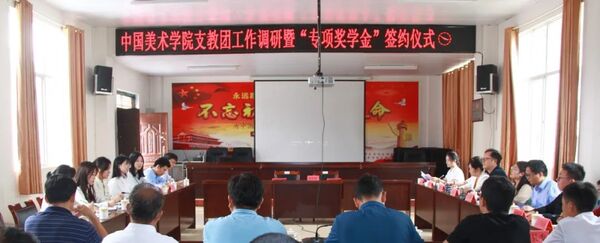 县委常委、宣传部长余婷婷、景东职业高级中学副校长阿应荣分别就景东县相关情况和美院研究生支教团八年支教成果做了详细汇报。最后,校团委书记卓美红与景东职业高级中学副校长阿应荣进行中国美术学院专项奖学金续约仪式。