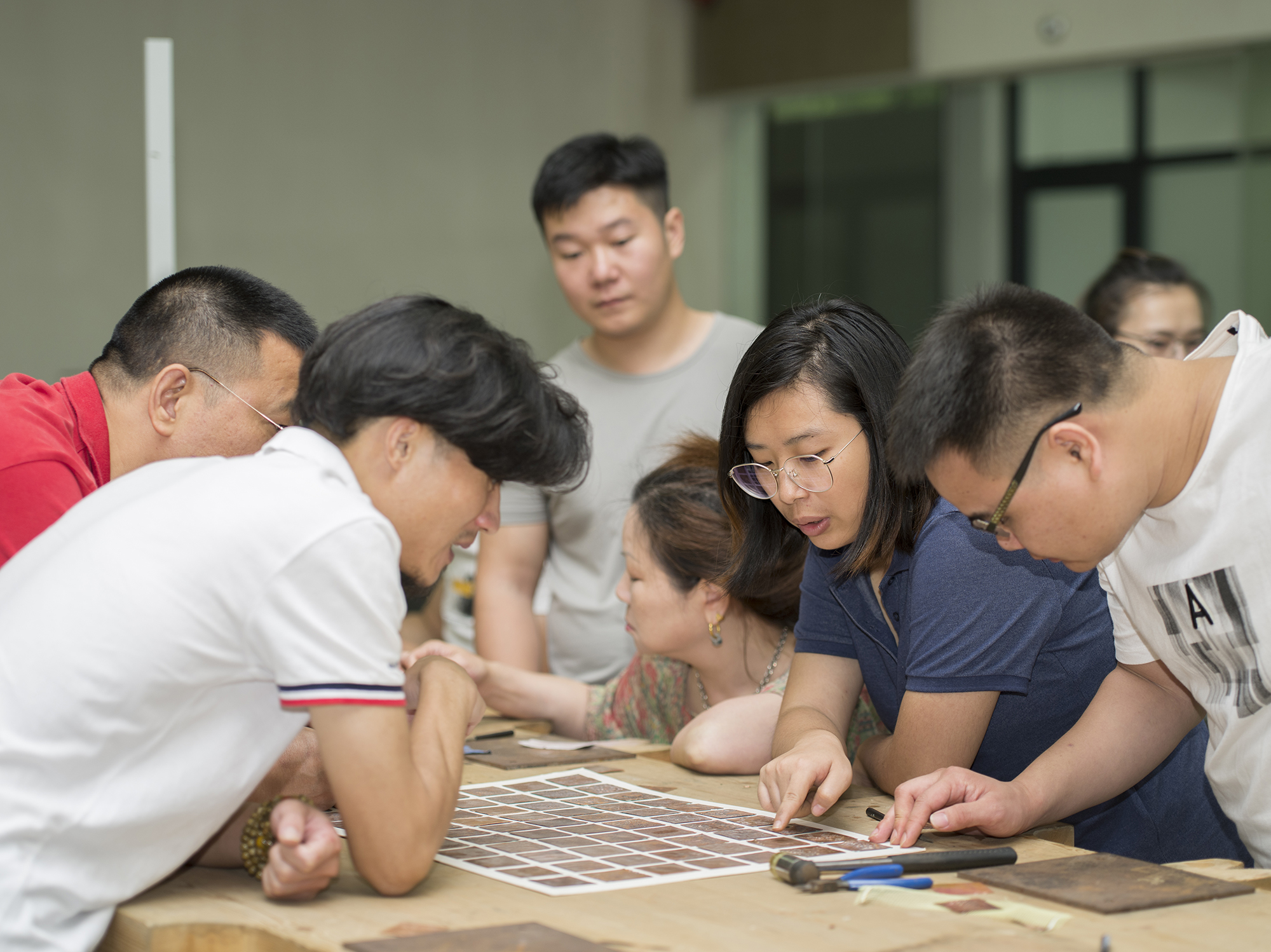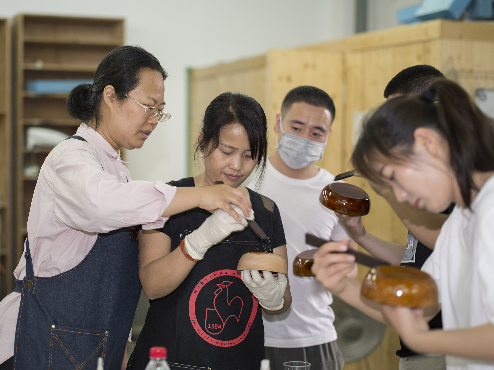 在开班仪式前一天学员便已经进入课堂开始了第一阶段基础技法的学习。技艺是手艺人独特的交流方式,来自不同地区传承着不同工艺的学员在动手实践的学习中已经快速进入了课堂氛围。来自云南的“乌铜走银”技艺传承人杨智闳是一名年轻的学员,他曾多次在不同地区不同院校参与传承人群的研培课程,“但是我第一次参加跨材料、跨工艺的专业艺术院校培训。”杨智闳说,“因为材质与工艺的跨界听上去很容易,但实际上是最难的,这需要我们了解材质本身的属性,还要懂得不同工艺的制作技艺,最后还需要转换思维将技艺很好地结合起来。所以能够参加中国美术学院承办的跨界研培班,是一件很幸运的事情。”宜兴的紫砂技艺传承人王晓丽选择了漆艺的基础课程,她在用发刷层层髹涂木碗的过程中颇有感悟。她说:“我们对这门工艺一无所知,但是可能手艺人对动手的技艺有着天然的好感,所以即便操作起来困难重重,仍然感觉很有意思。而且技艺其实是相通的,所以虽然我们在做着陌生的事情,但还是会有亲切感。”