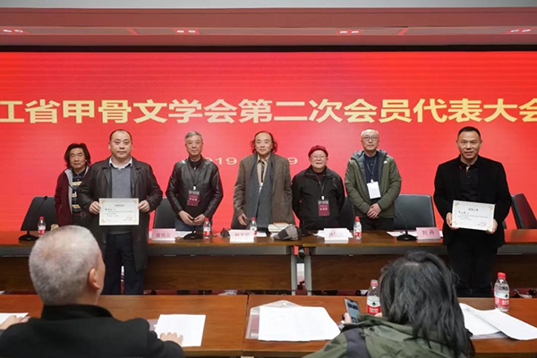 浙江省甲骨文学会是2010年由省文化厅和省民政厅正式批准成立的浙江省一级独立法人学会,现拥有会员110余人,集中了中国美术学院书法系的著名教授、专家及学者,以及全省在古文字书法领域突出的博士生、硕士生中坚力量及书法爱好者。因此,浙江省甲骨文学会具备了很强的学术权威,成为了带动一方文化产业发展中的重要机构。