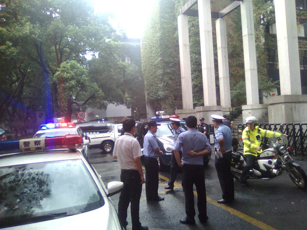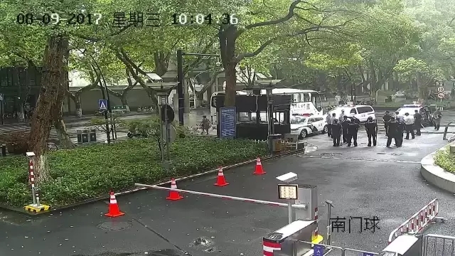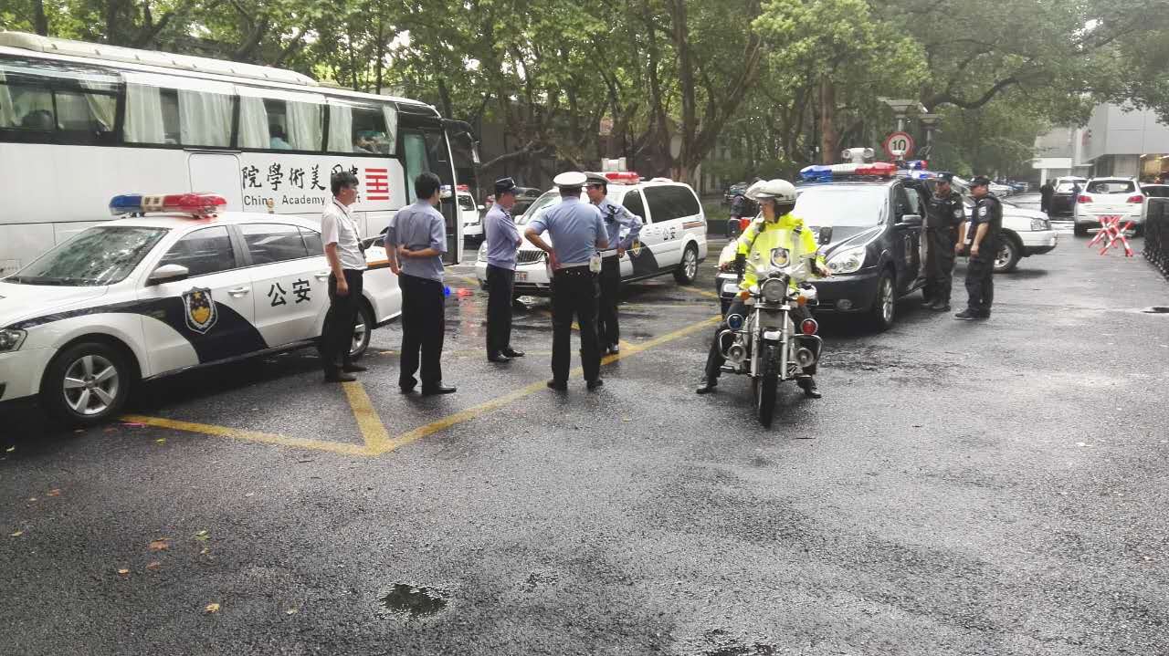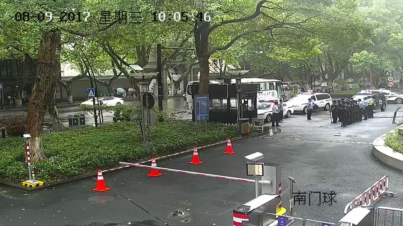8月9日上午十时,杭州市公安局反恐中心、上城区反恐大队、清波派出所联合对我院南山校区反恐应急处置工作进行突击检查:模拟有人在校门口拿刀砍人。校区正门口值勤保安发现情况第一时间用对讲机报告突发情况,保卫处值班人员接到报告后立即通知当班保安队长,令其带领正在校区巡逻的全体保安携带反恐装备和器械火速赶往校门口现场,全体保安人员从发现情况到赶赴现场共用时2分50秒。