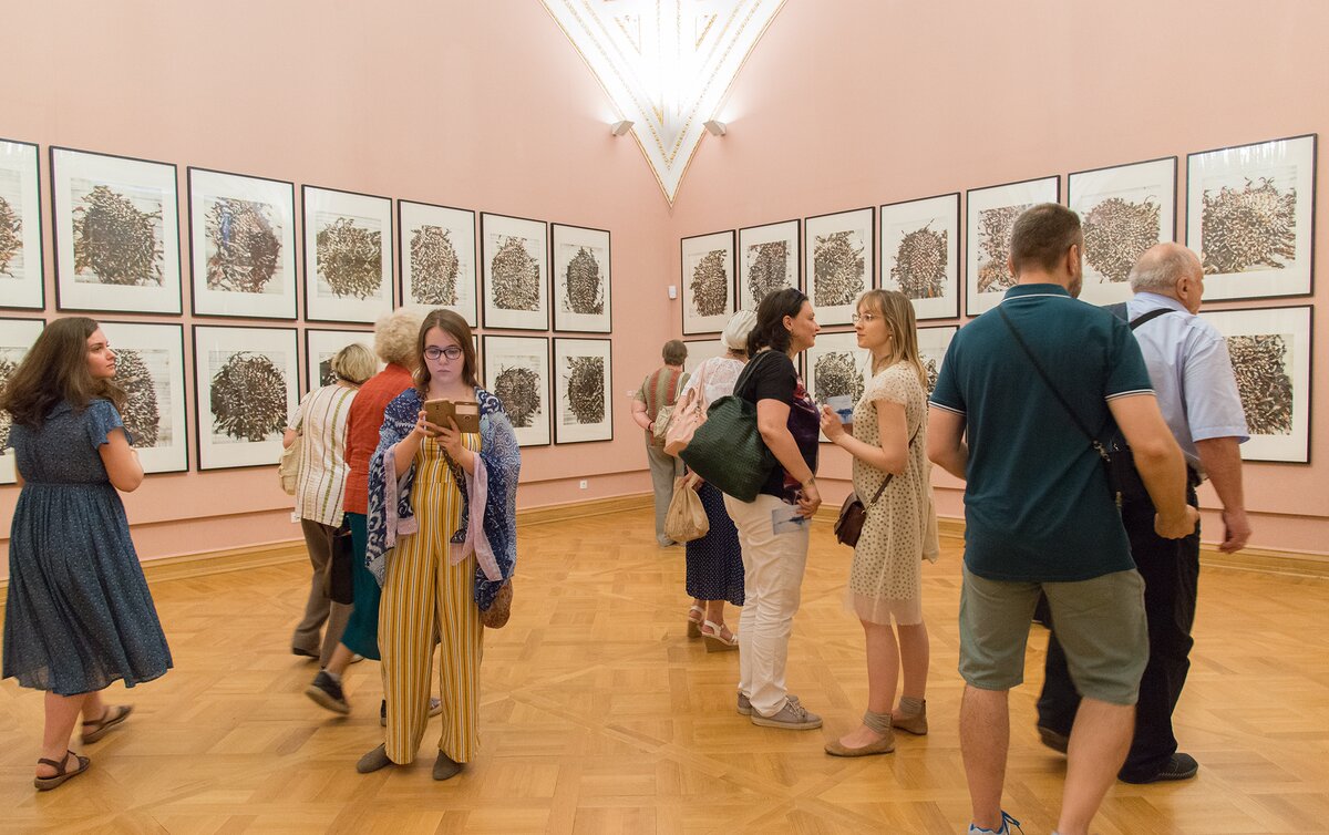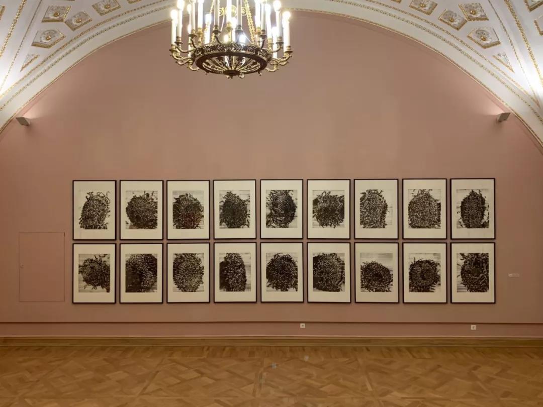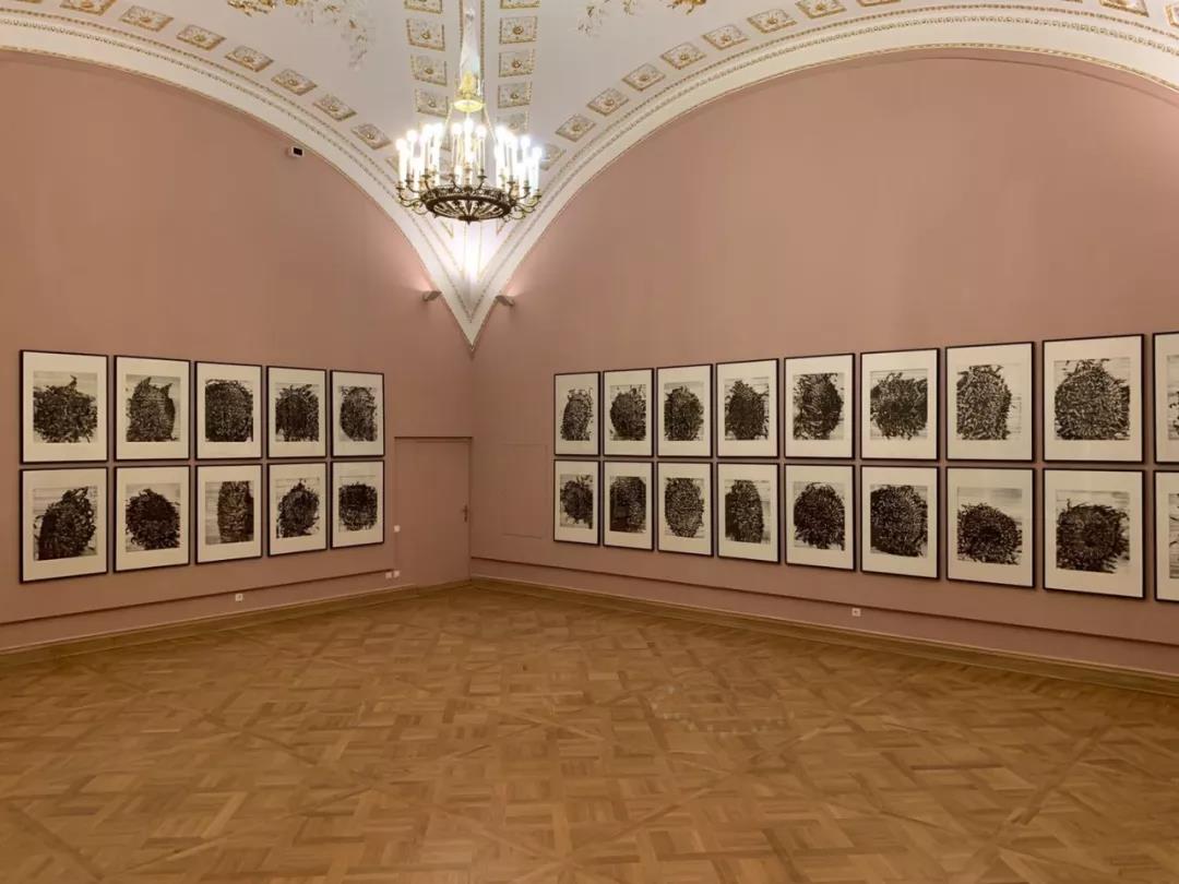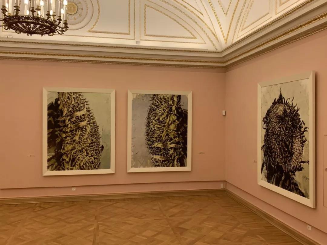 在俄博米哈伊洛夫宫四个展厅中,以「葵园肖像」与「野火」两个系列的硕大葵盘吸引了观众们的注意。而在旁边的宫殿中,展示着俄罗斯18世纪以来历代伟大艺术家的作品,这些人类艺术的瑰宝曾经在中国几代艺术家心中产生了深远的影响,这种深远的影响正如葵盘一样令人荡气回肠一下,它们与葵盘产生了跨世代、跨时空的鸣响,在不经意间催生出了意蕴深远的对话。