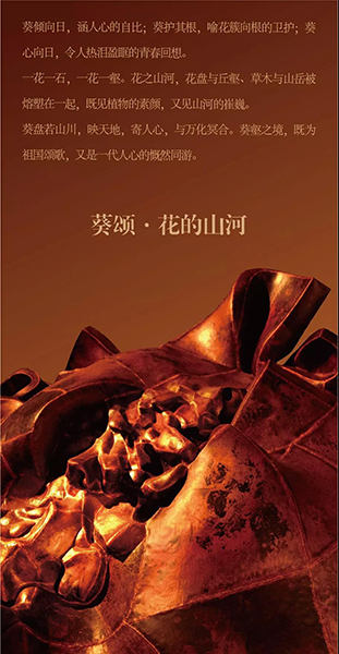 这是“向阳花开”的一代,也是与改革开放一路同行的一代。这一代人喝改革的水、呼吸开放的空气,最深刻地领受着这一伟大历史进程的洗礼与塑造。这葵之颂重新点燃“诗言志”的传统,葵体通体赤红,肃然矗立,如山如壑,势若星拱,却绽放为一团团奔涌的野火,散发出火红年代的激情与炙热。