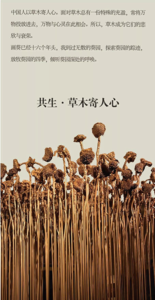 展览分为「葵壑·花的山河」「共生•草木寄人心」「野火•致火热的青春」「惠风•穿越葵园」「离歌•众生无别离」「生醉•流火如歌」「天涯•无断的地平线」「层览•越过山丘」「盘根•可待成追忆」葵颂九景。