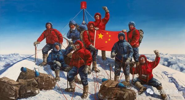《勇攀珠峰》,该油画作品来自鲁迅美术学院,创作者为:张志坚、刘海洋、张剑、李陶然。1975年5月27日下午2时30分,中国登山队女队员潘多和8名男队员从北坡登上珠穆朗玛峰,这是我国第二次登上珠穆朗玛峰,并首创女子从北坡登上世界最高峰的纪录。鲜艳的五星红旗飘扬在地球之巅,中国人民“无高不可攀,无坚不可摧”的英雄气概震撼世界。此次珠峰登顶成功,不仅改写了世界登山史,而且充分体现了我国在体育事业上所取得的辉煌成就。油画《勇攀珠峰》真实再现这一英雄壮举。
