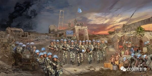 For Peace created by Li Zhuo and Ding Yongsheng from the Luxun Academy of Fine Arts features China's support to Africa during a UN peacekeeping operation. The artists re-created the scene on canvas over a period of two and a half years.