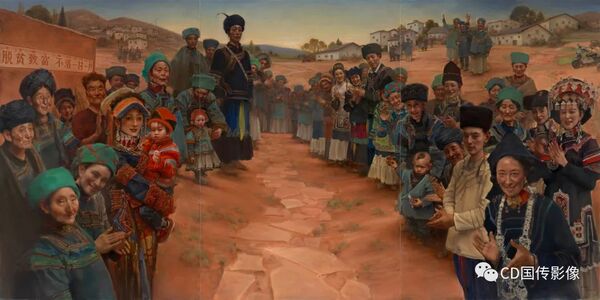《彝家新村欢迎您》,该油画作品来自四川美术学院,创作者庞茂琨,为了创作这幅作品,四川美术学院院长庞茂琨于2018年、2020年两度赴四川省大凉山彝族自治州山寨采风,用画笔记录了彝家新村生活的巨大改善。