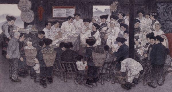 Greetings from Villagers of the Yi Ethnic Group is a painting with oil by Pang Maokun from the Sichuan Fine Arts Institute. To create the work, Pang visited villages in Daliangshan, Sichuan province, in 2018 and 2020, to see how life in the area had been improved.