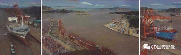 《东方大港:宁波—舟山港》,该油画作品来自中国美术学院,创作者为:杨参军、卢家华、王敏杰。宁波舟山港处于长江经济带的出海口,货物吞吐量全球第一,是江海联运的重要通道,为我国“一带一路”及 “海洋强国”的国家战略扬帆助力。作品提炼概括了舟山港的特点:山峦起伏,婉若游龙;港口水质倾向土黄色而非湛蓝色。三联画的形式,展现了 “万里海港横跨”的诗意,突出东方大港的气势。
