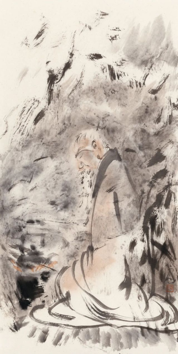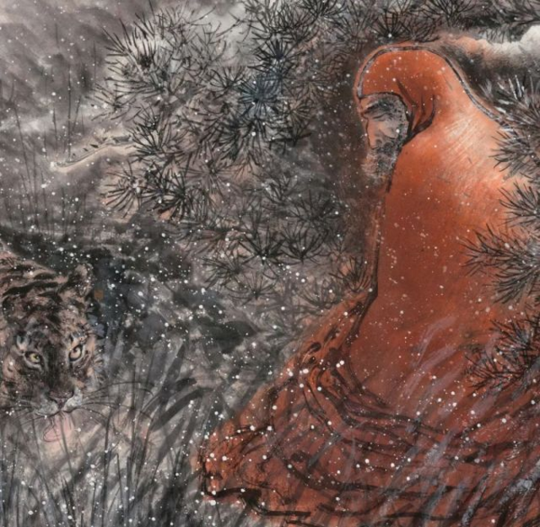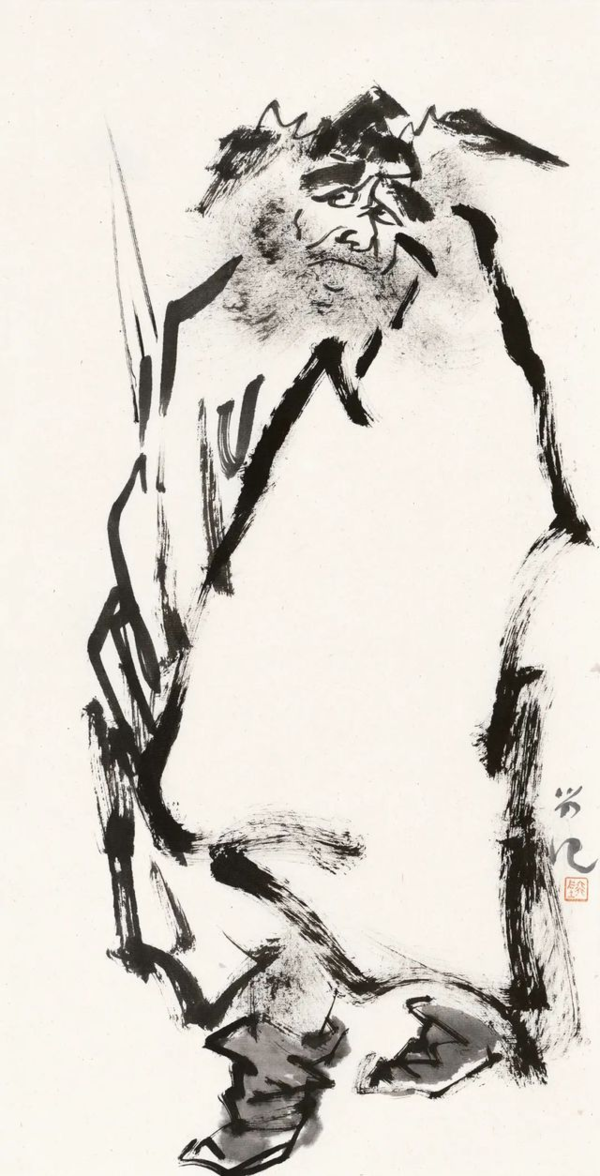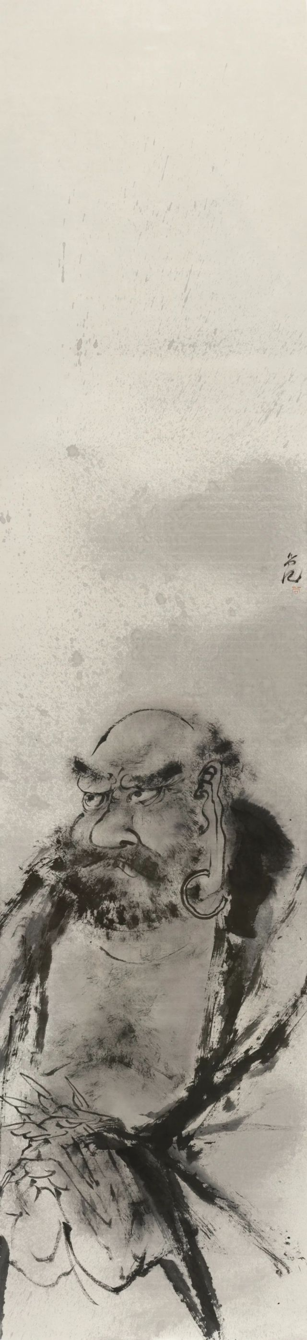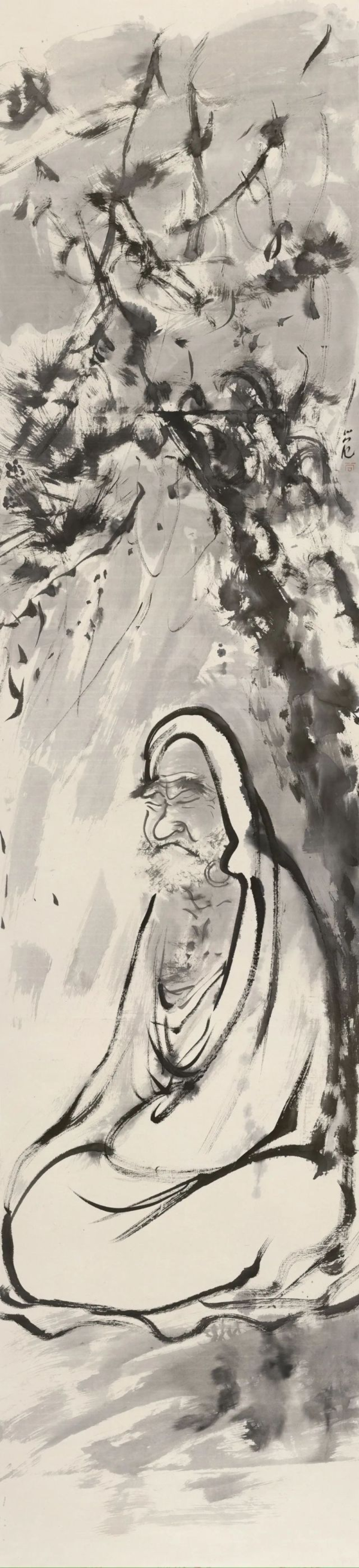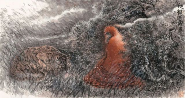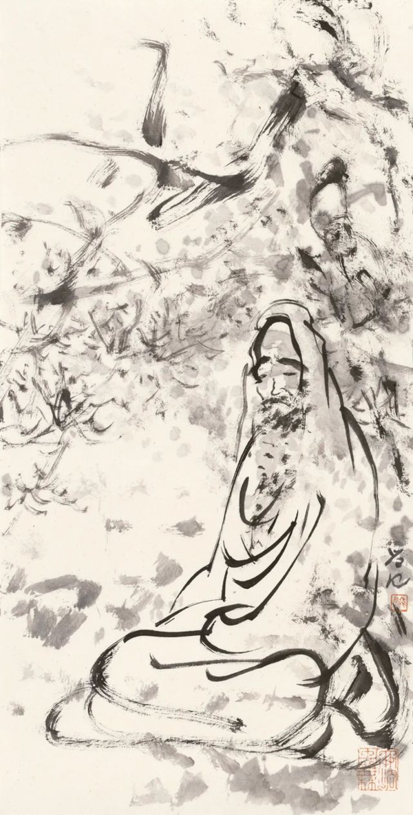 陆尚画的多是熟悉的人物和故事,平常却又不平常,定格的人物瞬间饶有情致,看似荒率的笔墨之下,含蕴着其造型笔法上的微妙变化,会在不经意的刹那间,仿佛与造型对象对视对话,体味到一种由诗性而延展开来的感动和思考,如其达摩造像,独立或有配景,置其身于松林下“听雪”,或于云崖间“心悟”,抑或于风雨中北渡,披长袍,须髯黑密,浓眉下双眼或观或寐,坚毅笃定,义无反顾,达摩便是他内心的观照。