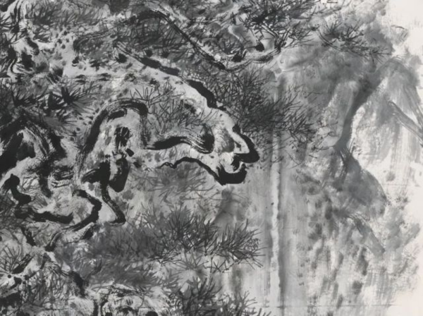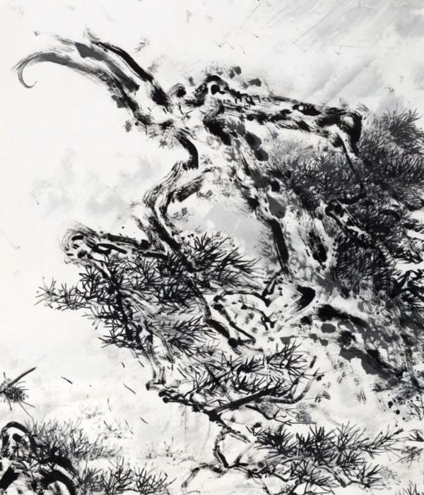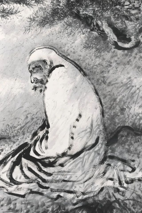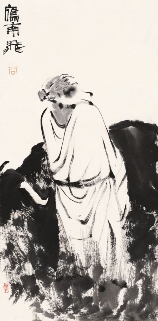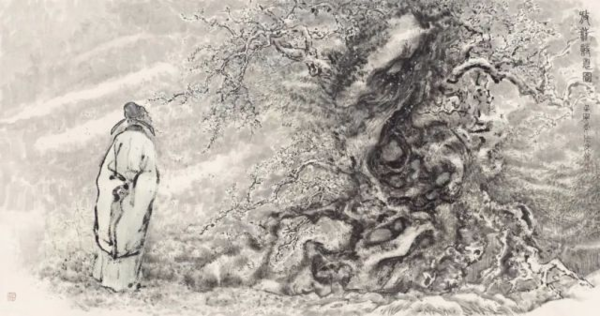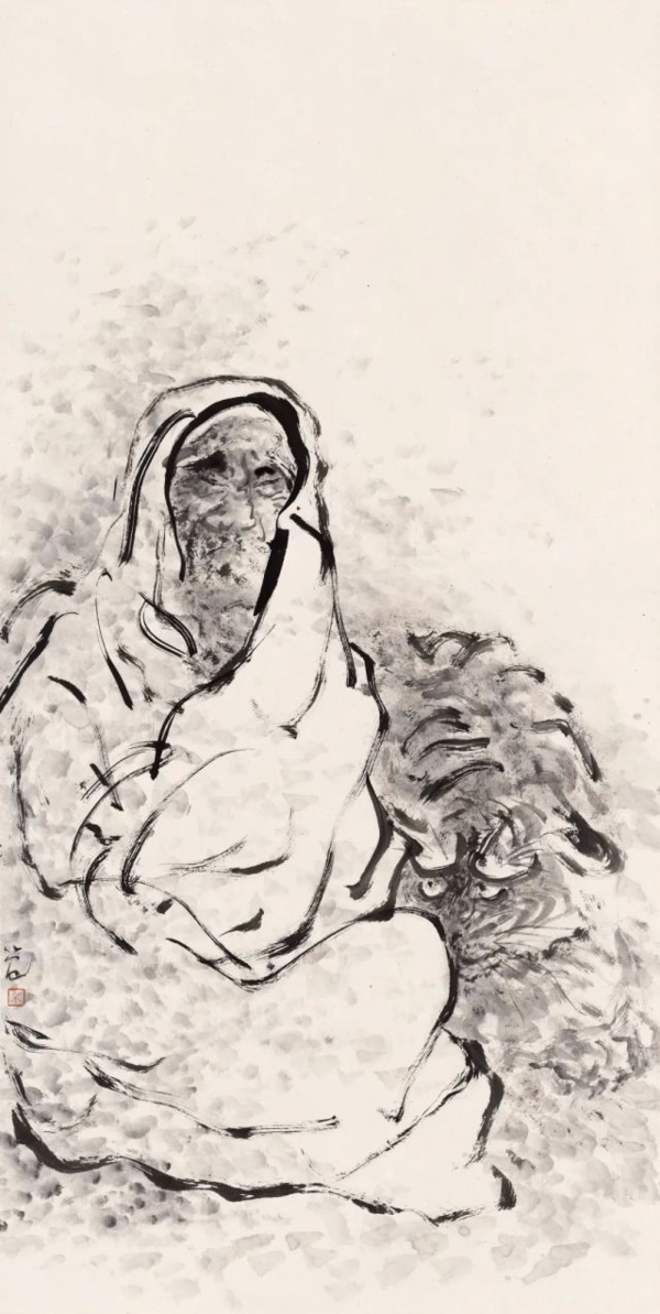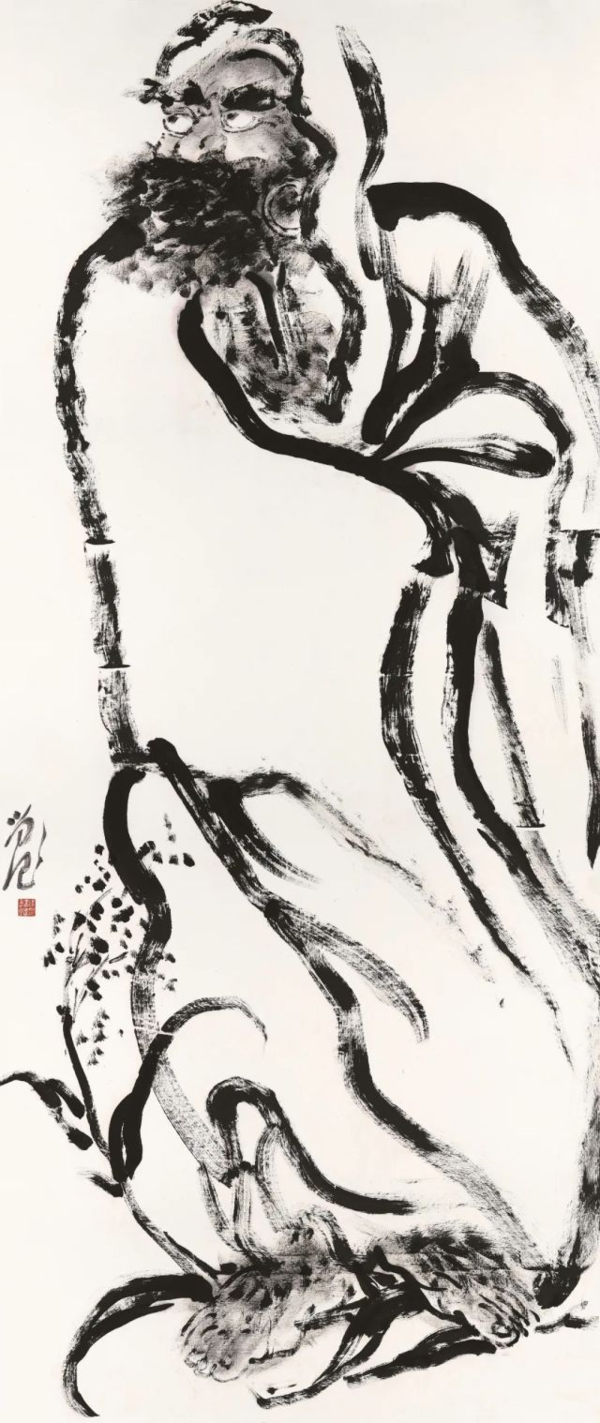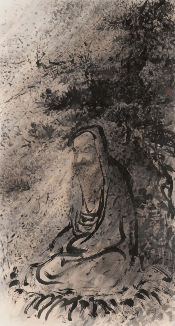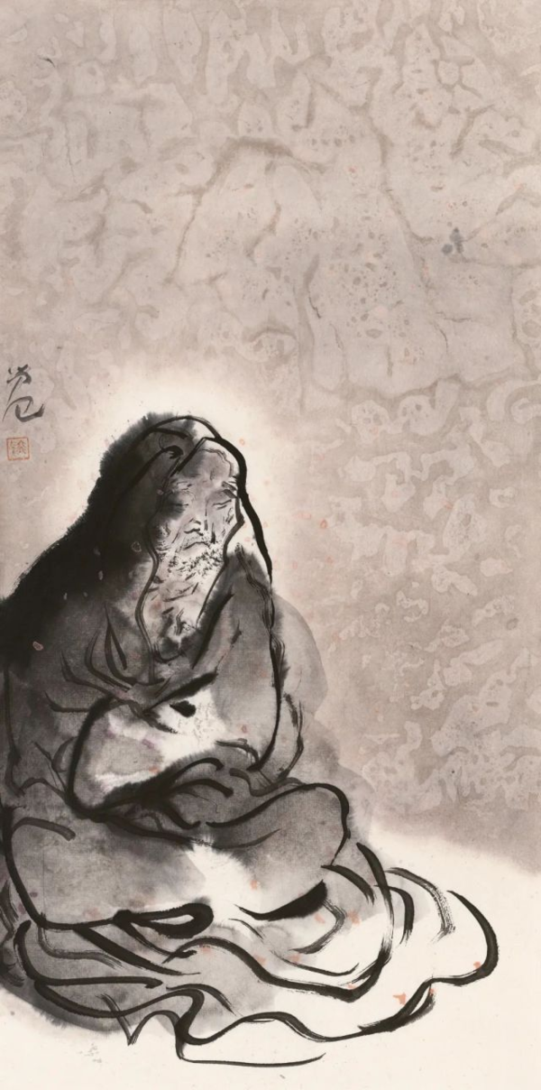 陆尚画的多是熟悉的人物和故事,平常却又不平常,定格的人物瞬间饶有情致,看似荒率的笔墨之下,含蕴着其造型笔法上的微妙变化,会在不经意的刹那间,仿佛与造型对象对视对话,体味到一种由诗性而延展开来的感动和思考,如其达摩造像,独立或有配景,置其身于松林下“听雪”,或于云崖间“心悟”,抑或于风雨中北渡,披长袍,须髯黑密,浓眉下双眼或观或寐,坚毅笃定,义无反顾,达摩便是他内心的观照。