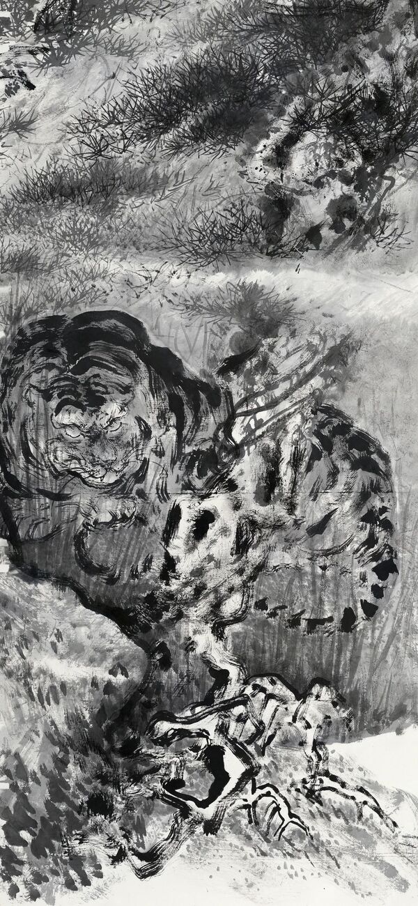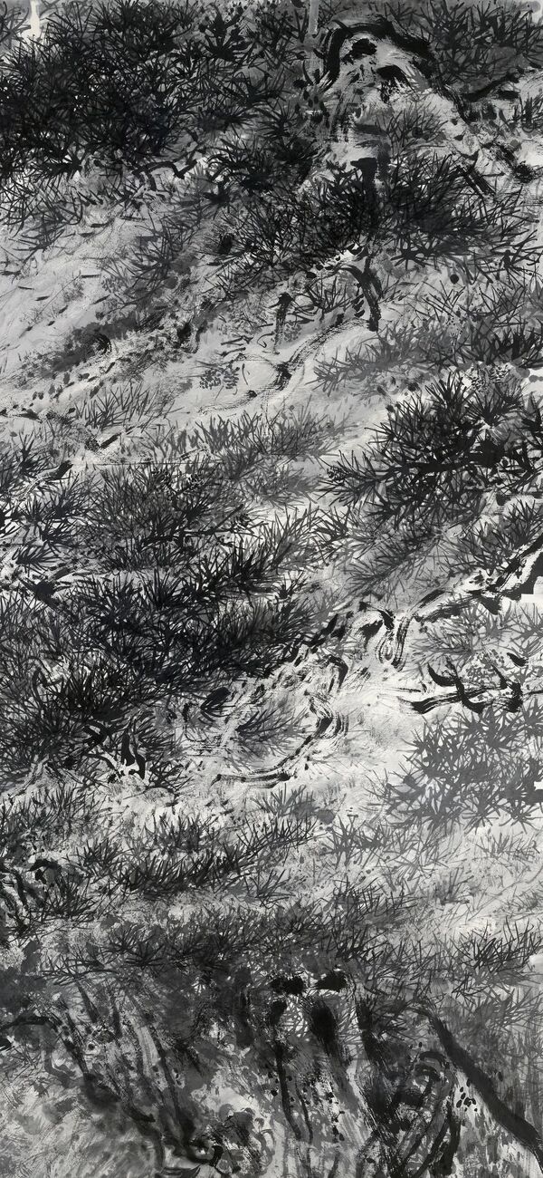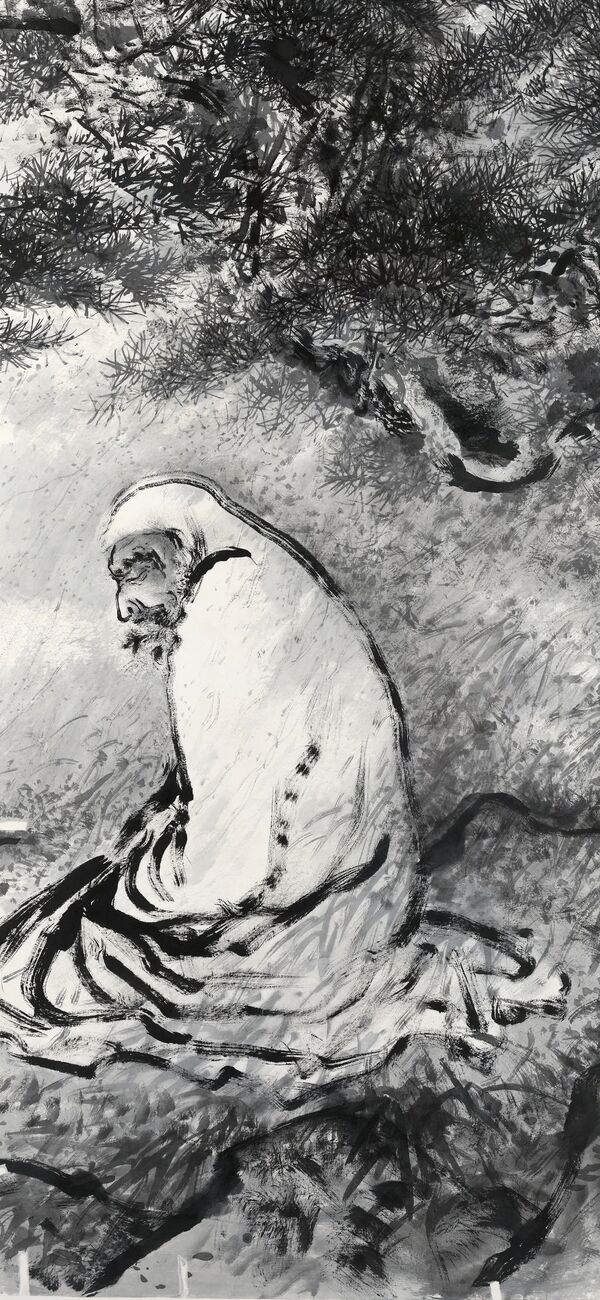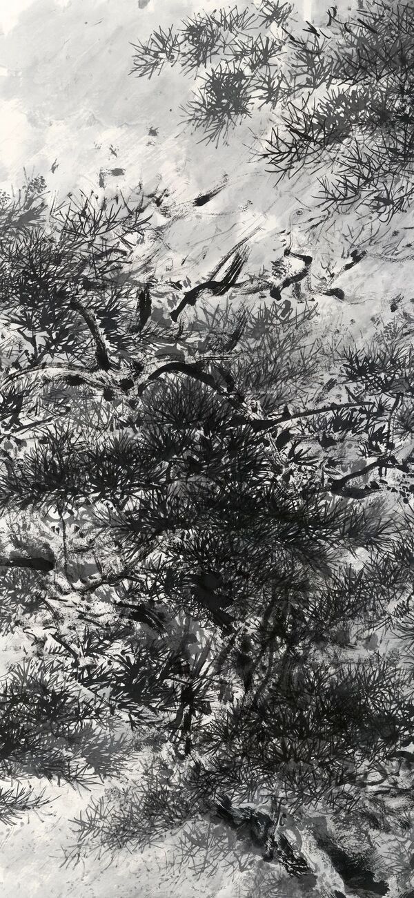 或许是很多年来,已没有见到这一类气象的作品了,突然见着,有点兴奋。不是因为幅尺大,而是因为以古法为主的罗汉与松涛,墨象气质全然脱掉了现实气息,与所谓的潮流拉开不小的距离,这种距离有力量、有感染力。在当下,许多画家已不愿意沉静下来,对中国传统绘画题材做深入研究和实践,对于笔法、章法、气息、境界等不涉及,而有能力把握此法的人已很少了,而在中国画传承的大道上突显自我绘画语言就更微乎其微,还别说有什么做派。而陆尚在这一手法的实践里,正暗合了中国传统文化复兴与回归这一意识。