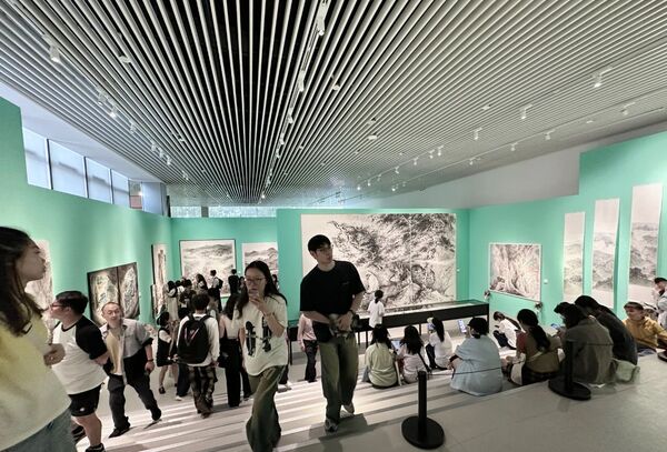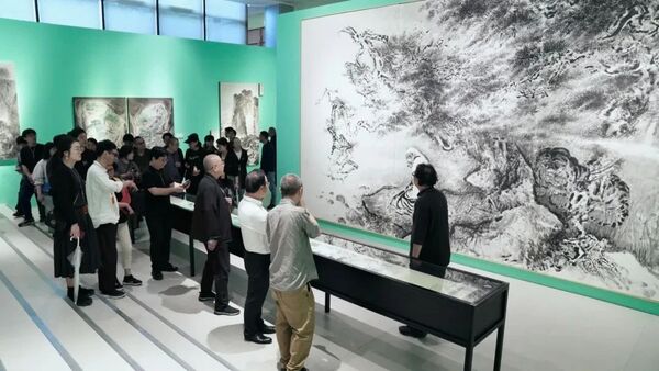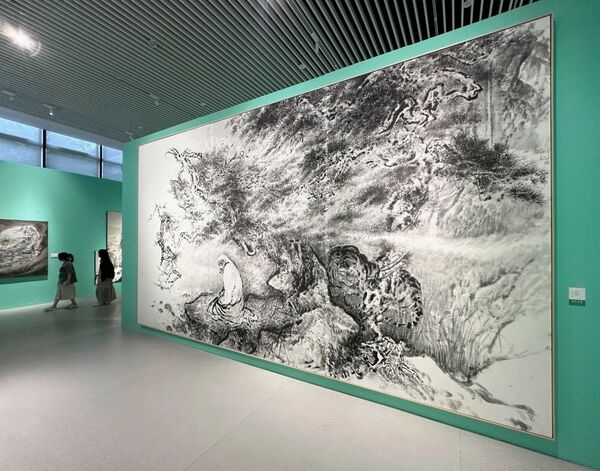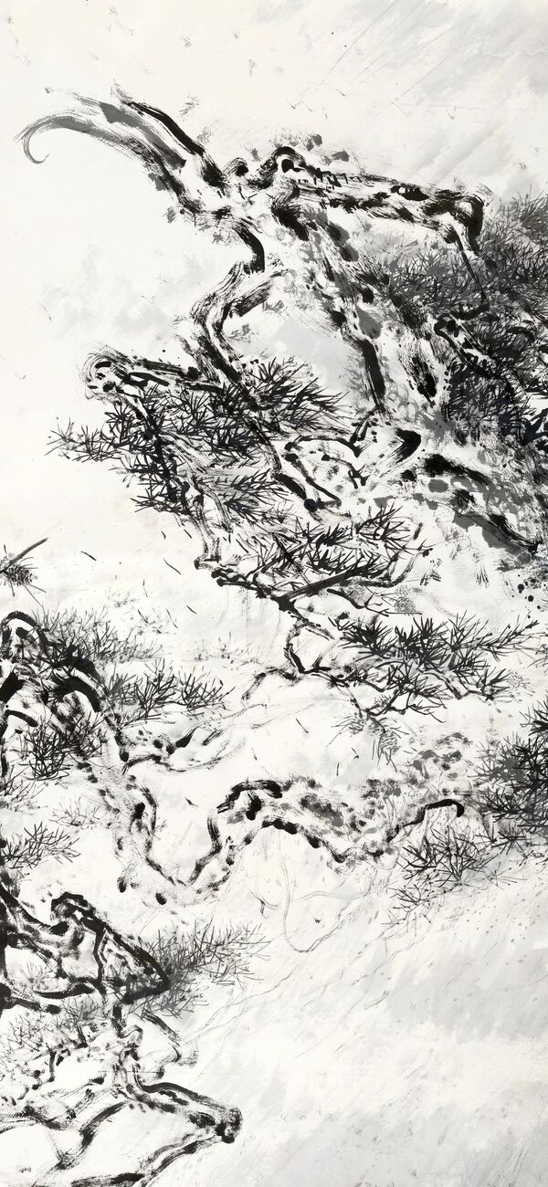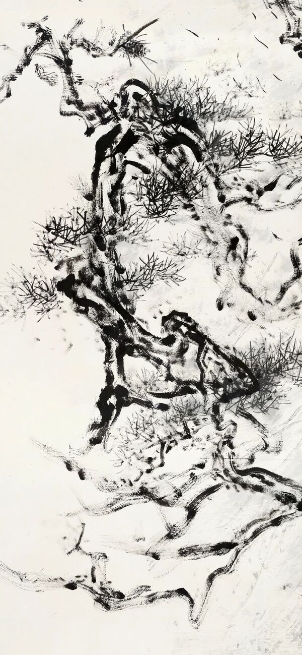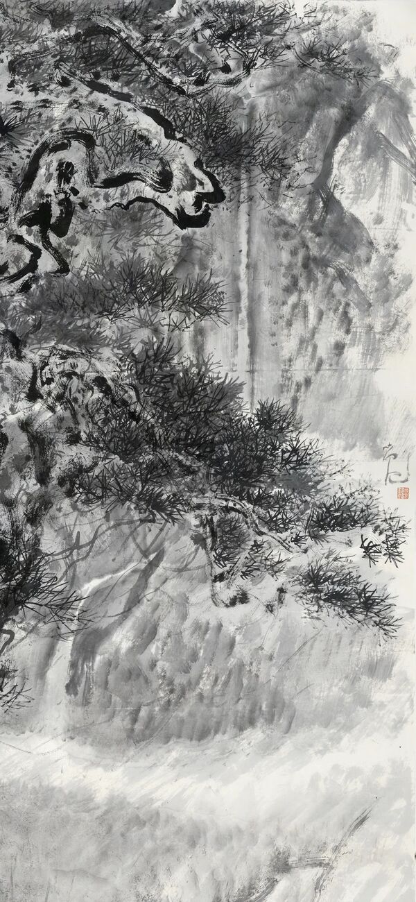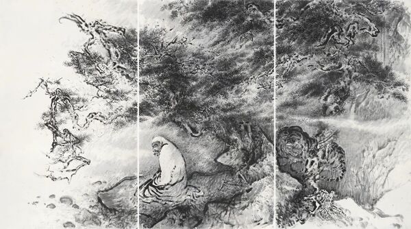 或许是很多年来,已没有见到这一类气象的作品了,突然见着,有点兴奋。不是因为幅尺大,而是因为以古法为主的罗汉与松涛,墨象气质全然脱掉了现实气息,与所谓的潮流拉开不小的距离,这种距离有力量、有感染力。在当下,许多画家已不愿意沉静下来,对中国传统绘画题材做深入研究和实践,对于笔法、章法、气息、境界等不涉及,而有能力把握此法的人已很少了,而在中国画传承的大道上突显自我绘画语言就更微乎其微,还别说有什么做派。而陆尚在这一手法的实践里,正暗合了中国传统文化复兴与回归这一意识。