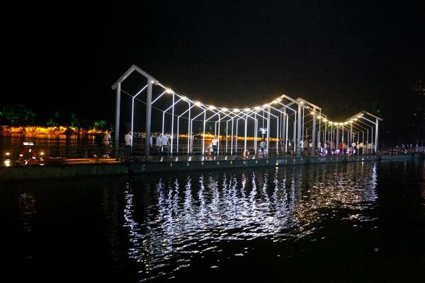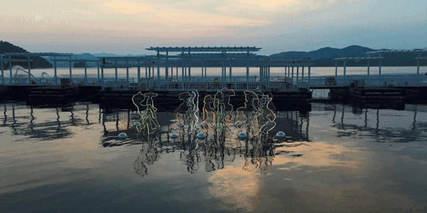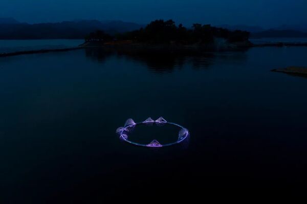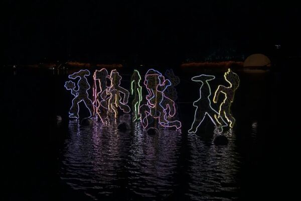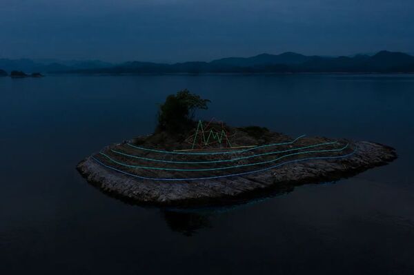 ⼈们总是想在⽔上⾏⾛,⽽这件装置艺术作品就坐落于千岛湖畔,由各式各样的人物剪影组成。他们形态生动、颜色各异,内部和外部均用不同颜色的线进行连接,在视觉上创造了“水上漫步”的趣味画面。作品的概念源自我从2008年开始专注的创作主题,旨在通过线性语言,在千岛湖的水面建构一种开放的交流空间。作品借助线在不同形态的人之间的反复穿梭,表达了一种将不同起源和文化背景的人联结起来的美好愿景。线与纤维通过此装置创造了一个认知与视觉、思维与物质对话的空间,这些用灯光勾勒的“人”,不仅行走在千岛湖的水面,也穿梭于不同的时空与文化线索中。