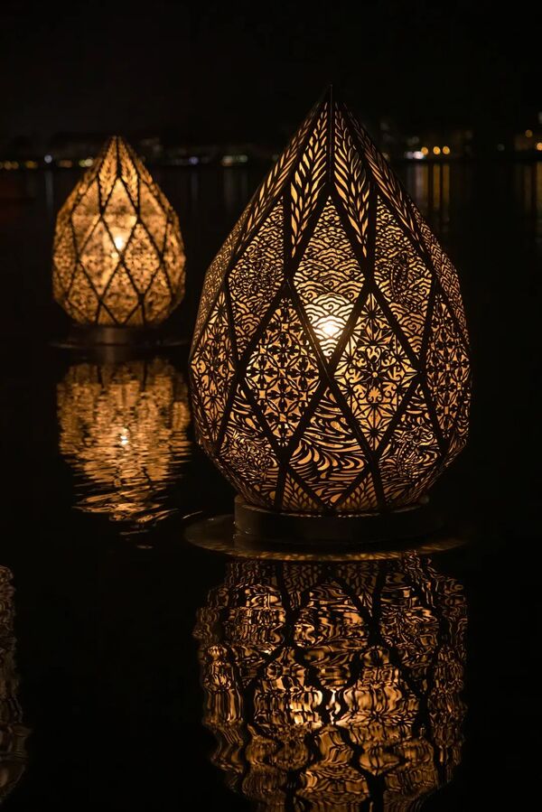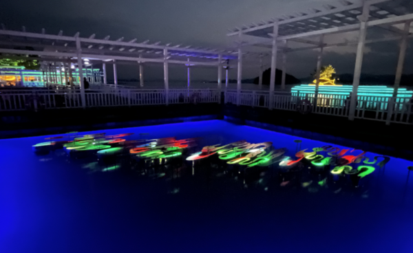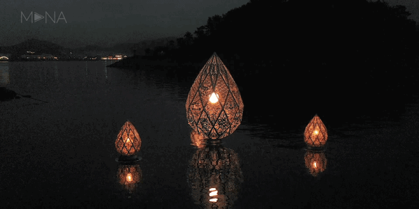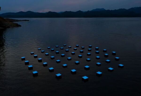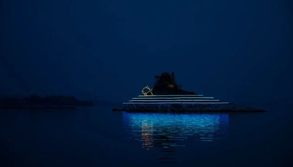 作品构思源于千岛湖的千岛形态,将千岛湖的岛形还原成一个个镜面的漂浮物,灯光在“岛群”之上萦绕,就如同《少年派》中的奇幻海洋,星星点点,营造光影梦幻的效果。