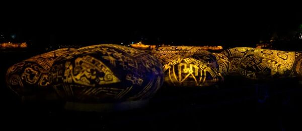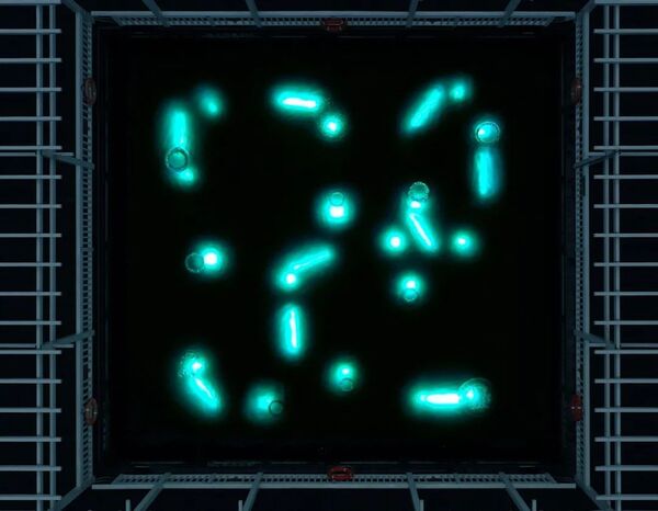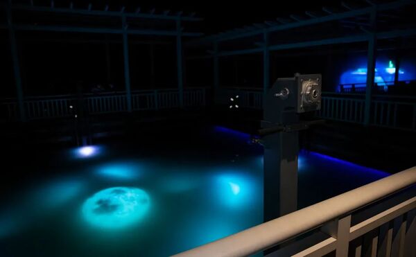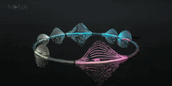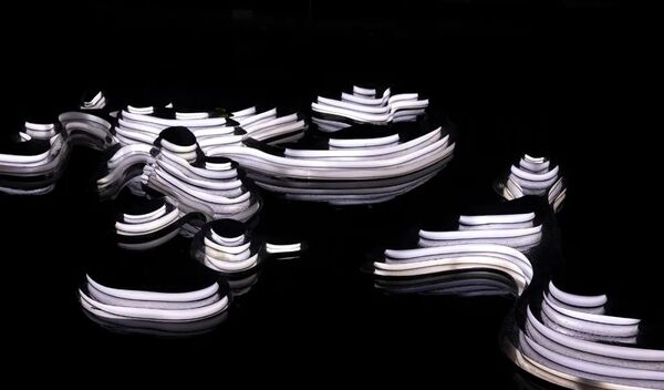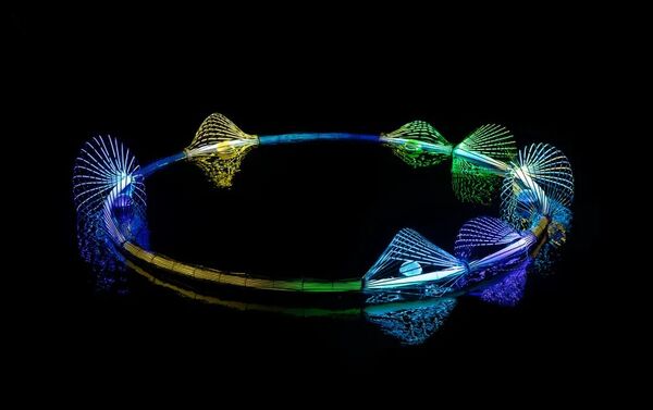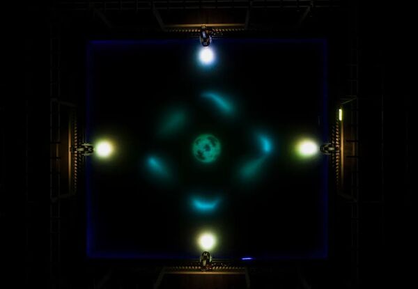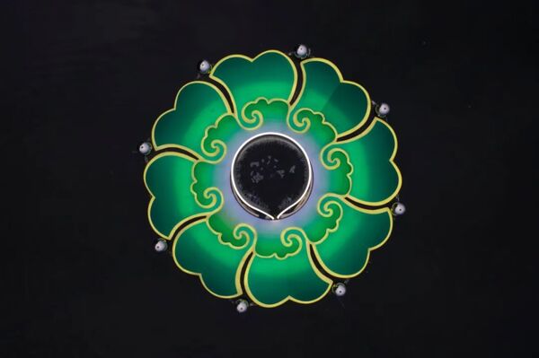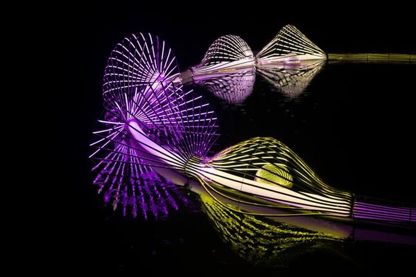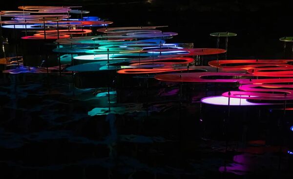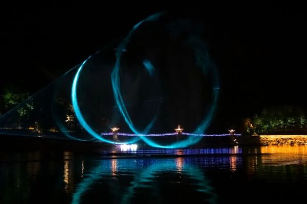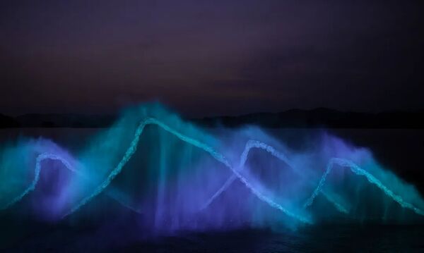 水下深处升起一个个环形气泡(涡环),在灯光的渲染下炫彩剔透。通过编排,涡环时而形如入水阶梯层层叠叠,时而形如湖底秀水之灵的音波,时而形如密集的争食游鱼。水下涡环发生器阵列排版作品根据预先设定的激发顺序,构成多种不同造型的涡环阵列。