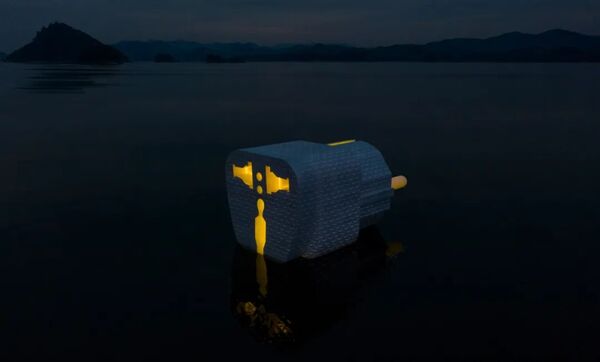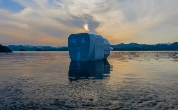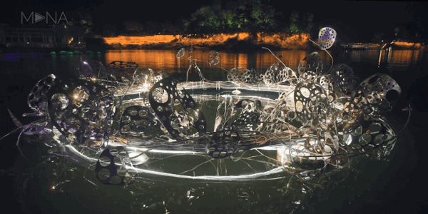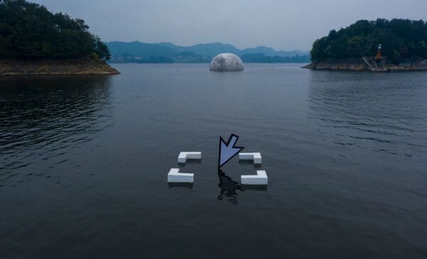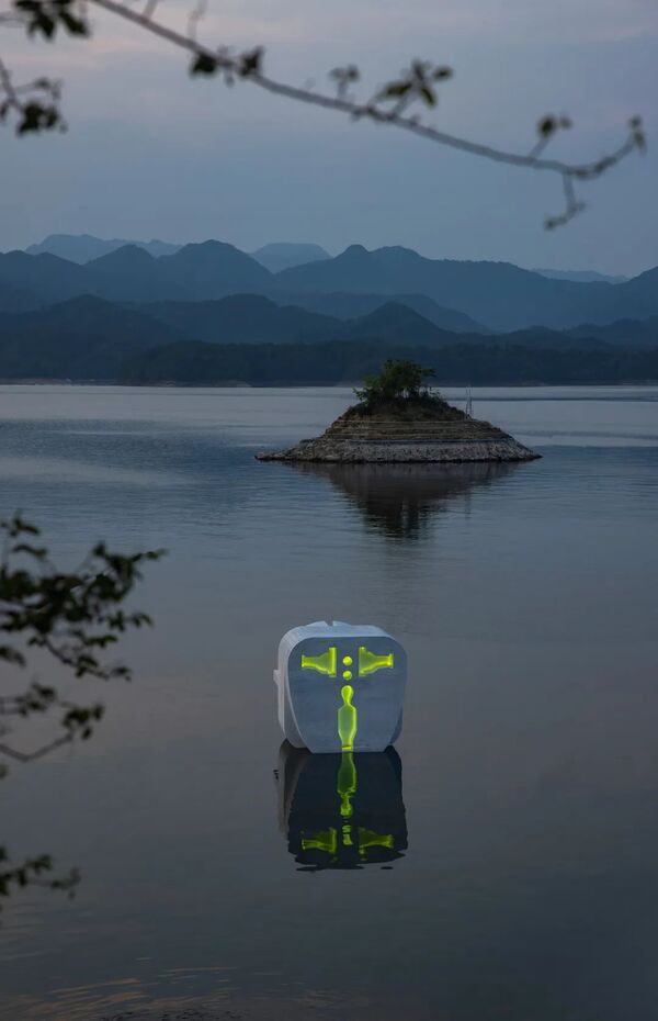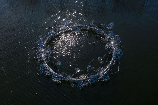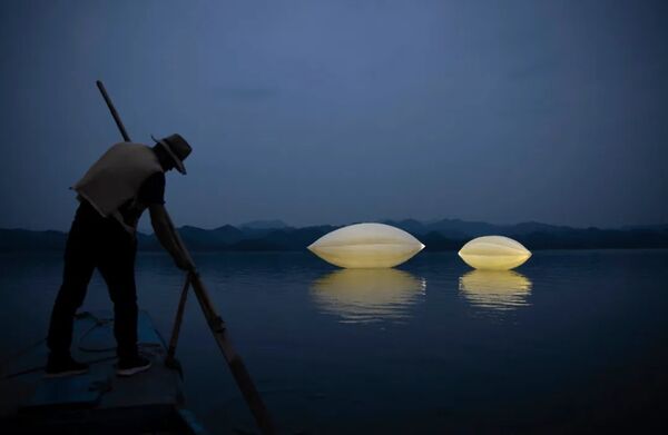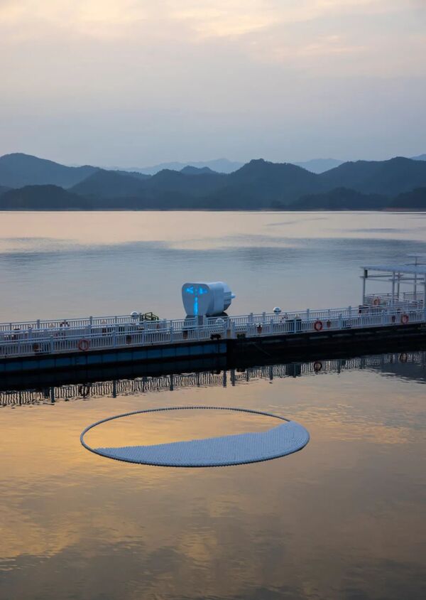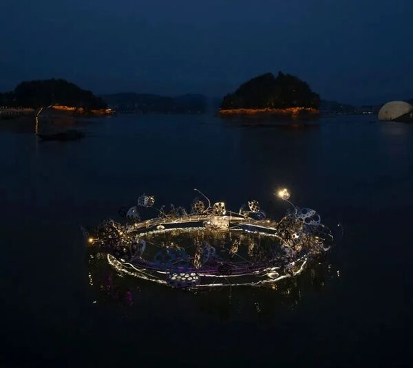 作品是一件花冠形式的漂浮雕塑,旨在向水下狮城致敬。 狮城在1959 年为长眠水底,变成了一个神秘且美好的记忆。古城的迁移和时光变迁就像影子,而花冠仿佛就像一盏灯,提供了点亮水库的最好契机。