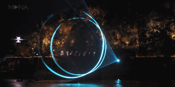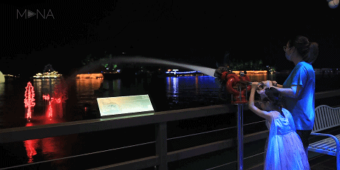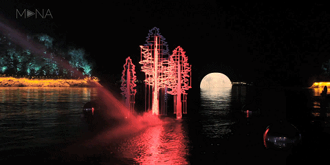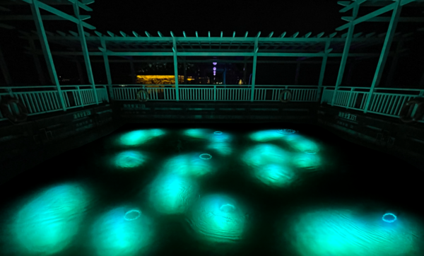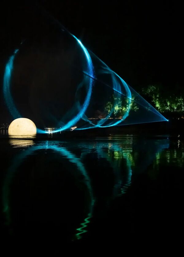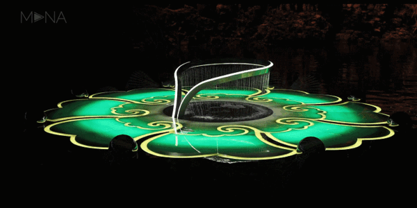 《镜月》是一组互动灯光影像装置作品,作品运用水中镜像屏幕和水岸灯光装置,通过公众在光束之间触动红外感应及肢体表演参与,转译为多变的光影可视化运动,从而诗意化的表现出“人挚明月不可得,月行却与人相随”的诗意,在“春风又绿江南岸,明月何时照我还”的意境中,映照出人们身心的回归与安宁,从而在互动体验中感受到心灵的抚慰和精神的桑那。