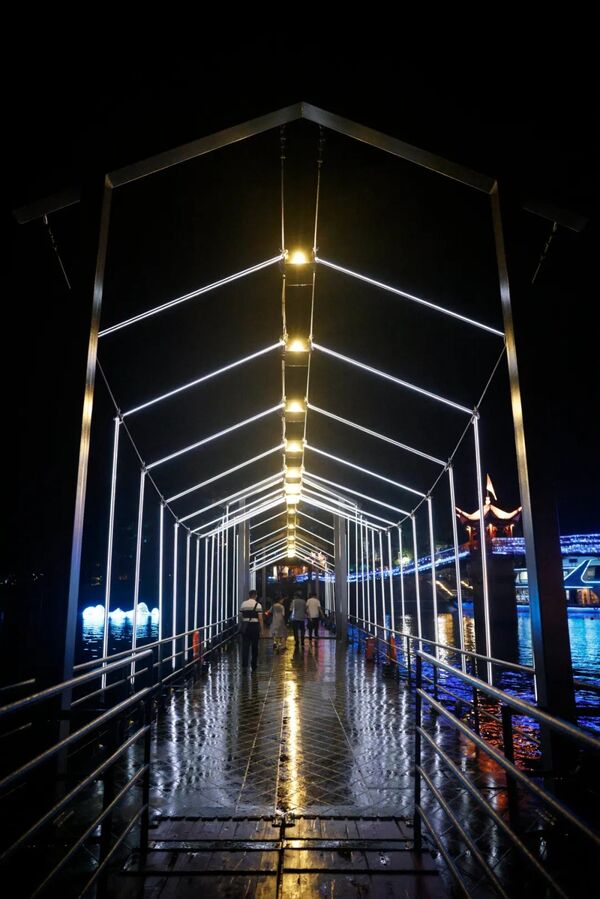 矩形灯框的排列勾勒出吊桥优美的外形的同时形成光的通道,走在桥上就是进入时空的隧道,随着桥板受力倾斜运动,光的隧道也小幅震荡扭曲,光的矩阵失去规则的秩序感,人进入一种空间扭曲的幻觉。
