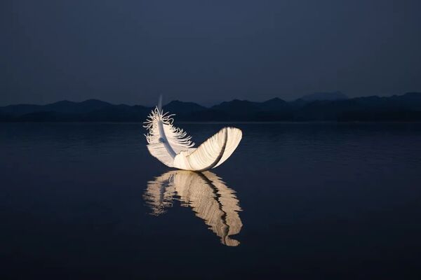 一片洁白的羽毛飘落在千岛湖面,成为一道独特的风景。《落羽》以白鹭的羽毛为创作元素,以装置艺术的空间形态融入光影艺术媒介,以诗意的东方人文语境构建千岛湖“秋水寒白毛、夕阳吊孤影”的唯美意境。