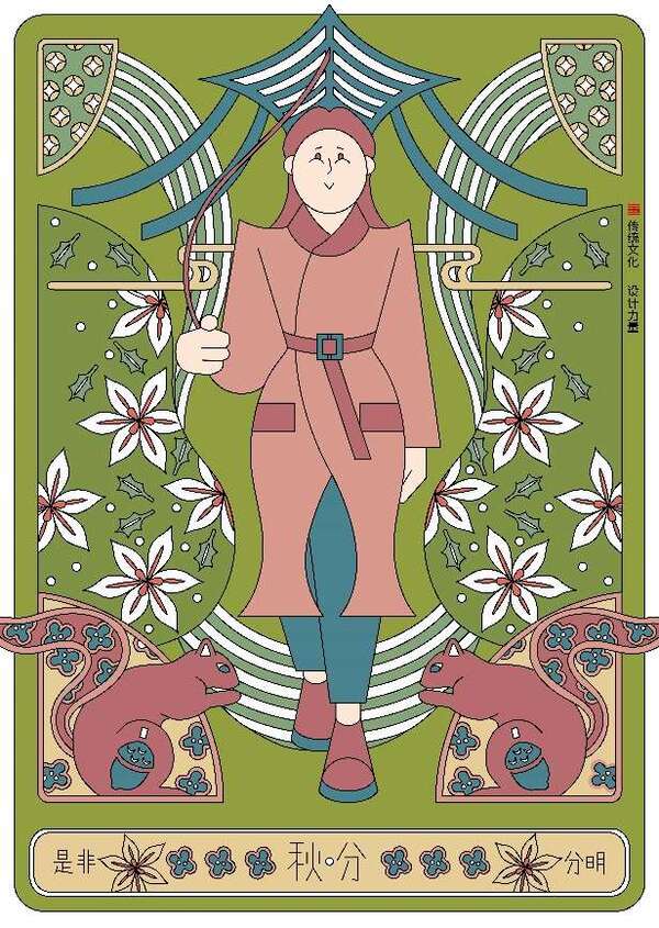 秋分还有不少有趣的传统活动。“秋分到,蛋儿俏”,竖蛋便是其中之一。在这一天,选一枚光滑匀称、刚生下四五天的新鲜鸡蛋,轻手轻脚地将它在平面上竖立起来。据说这其中还有一些科学道理:首先,这一天昼夜平分,地球地轴与公转轨道平面处于一种力的相对平衡状态,因而蛋的稳定性好;其次,生下四五天的鸡蛋,蛋黄素带松弛,蛋黄下沉,重心下降,有利于蛋的竖立。徐茜雅的作品以两颗椭圆表现竖蛋场景,辅以鲜明黄色,展现秋日氛围,再用银杏叶等小元素点缀其中,让人感到活泼明快、富有趣味。此外,秋分时节,天朗气清,风力适中,也正是孩子们放风筝的好时候,在张婕的作品中,视觉中心位置便是一放风筝的孩童,在旁边,松鼠们也开始储存过冬的食物,生动可爱,充满童真童趣。