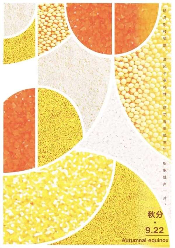 秋高气爽,碧空万里,稻谷飘香,蟹肥菊黄,秋分是美好宜人的时节,同时也是农业生产上的重要节气。从2018年起,我国将每年农历秋分设立为“中国农民丰收节”,这既是亿万农民庆祝丰收、享受丰收的节日,也是五谷丰登、国泰民安的生动体现。冯可欣选用五谷作为秋分节气的名片,将稻、黍、稷、麦、菽分别用不同的方式呈现,结合他们本真的色彩进行设计,让整张海报散落一片金色的光芒,洋溢着秋日的温暖。