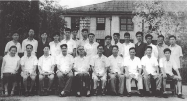 与潘老等先生合影,前排左起刘苇、费以复、肖峰、高培明、潘天寿、黎冰鸿、总务处长、郑思同、王德威,后排 左起卢坤峰、张桂铭、周毛金、吴山明、张锦标、倪绍勇、李绍然、吕丁、金光渝、张亦浩、金正惠、徐友生、毕彰、 杨象宪、苏春生。1964年摄