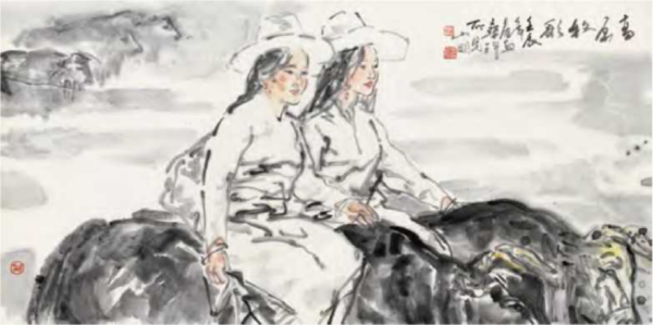 二是生活气息很浓,充满家国情怀,情系江山社稷,情系百姓民生。他们这一代人有很多共同特点,在作品中透出很强烈的家国情怀,这也是中国传统文人的优秀品质。再一个很突出的一个特点,是生活气息很浓,有着非常鲜活的生活气息。他的作品几乎都是从写生中来的,大量的少数民族的生活,藏区的,还有南方傣族的题材,显然是深入生活的成果,体现了新中国以来党一贯的艺术主张,也使绘画有了更多的鲜活生活气息,因为对生活的关注就是对当代的关注。