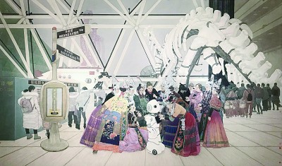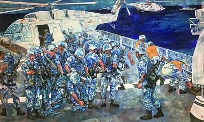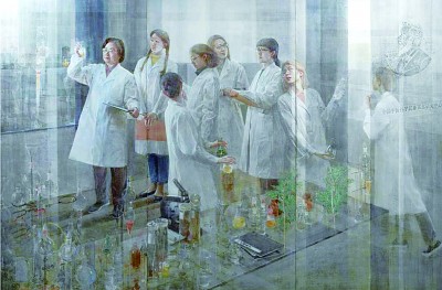 此外,范春晓的中国画《中国制造走向世界——919大飞机》精细刻画了国产大飞机的精密构造,反映了国家科技制造业水平的飞跃;孙博的油画《笑迎五洲客》聚焦中国国际进口博览会的盛况,透视出更加开放包容的中国;刘鲁新的中国画《深蓝,深蓝》通过对中国军人形象的塑造,展现出钢铁之师的血性与担当;寇泽旭的中国画《一切为了生命》以充满形式感的艺术语言,致敬了坚守在疫情防控一线的医务工作者;桑建国、张学枚等创作的中国画《文化科技的共享时代》则描画出文化、科技繁荣发展为人民带来的幸福生活……新作、佳作的涌现是此次展览的亮点之一,美术家们在近年来的主题性美术创作中,积极描绘新时代的发展面貌,挖掘和表达新时代的精神内涵,许多作品洋溢着开拓创新、兼容并蓄的崭新气象,展现出奋进新时代、迈向新征程的美好图景。