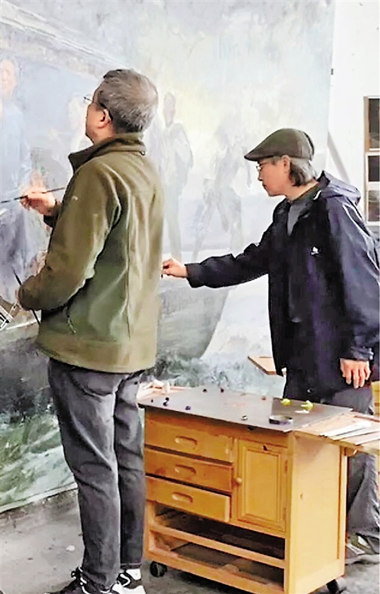 为此,两位画家经常反反复复地讨论,一边画一边考证历史资料,邀请党史、国史专家进行解读论证,还跑到南湖边近距离观察红船,租船在湖上游了两圈,又到南湖革命纪念馆学习调研。