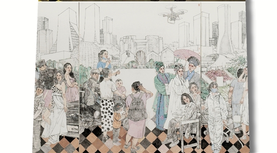 2020年夏天,翁诞宪接到“嘉善开展全国县域科学发展示范点建设”的题目后,第一时间直奔嘉善探访。经过当地文联介绍,他参观了嘉善规划展示馆、大云巧克力小镇等地,对嘉善原本模糊的印象渐渐清晰了起来。“改革开放以来,嘉善在产业转型升级、城乡一体化、对外开放和区域合作等方面取得了显著成效。我的作品,就是要表达嘉善的城市和乡村一样美好,城乡人民都享受着幸福生活。”翁诞宪以传统江南水乡西塘为背景,以民宿的发展预示产业升级,画面前景则展示了多种幸福人生:老年人在打太极拳,妇女欢乐地跳着广场舞,年轻人在巧克力小镇里拍摄婚纱照、享受亲子活动。在同一个时空场景里,既融合了丰富的元素,又表达了深刻内涵。